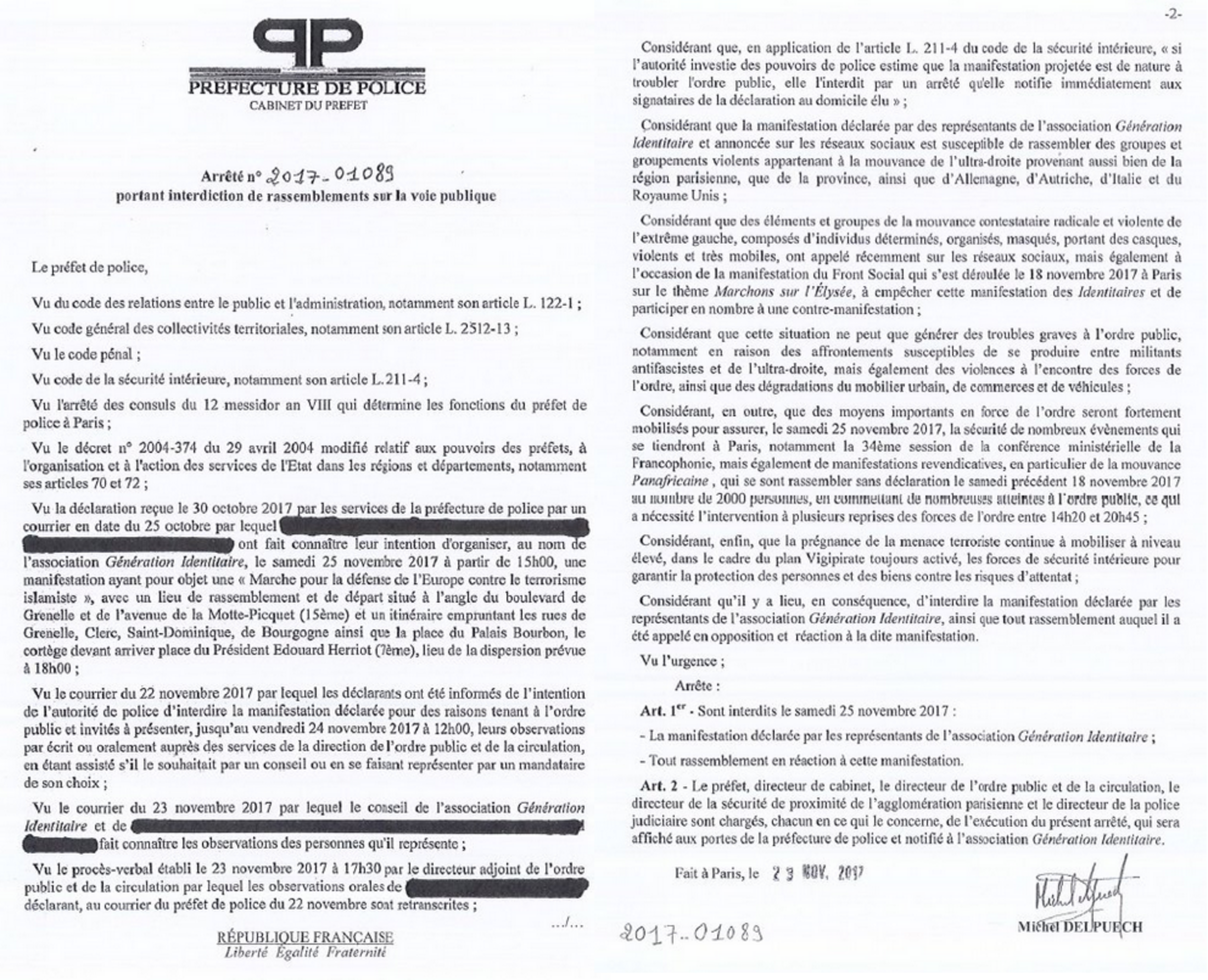 Ce matin se tenait au tribunal administratif de Paris l'audience au cours de laquelle l'association Génération Identitaire demandait au juge des référés de suspendre l'arrêté du préfet de police de Paris interdisant la manifestation prévue un peu plus tard dans la journée. Selon la déclaration de manifestation reçue par les services de la préfecture, cette manifestation organisée par le mouvement d'extrême-droite avait pour objet "une Marche pour la défense de l'Europe contre le terrorisme islamiste". Au regard des risques de trouble à l'ordre public que pouvait créer ce rassemblement et en réaction à la contre-manifestation anti-fasciste qui s'organisait sur les réseaux sociaux, le préfet avait finalement décidé de son interdiction. Le tribunal administratif a rejeté, une heure avant l'heure de la manifestation, la requête présentée par l'association.
