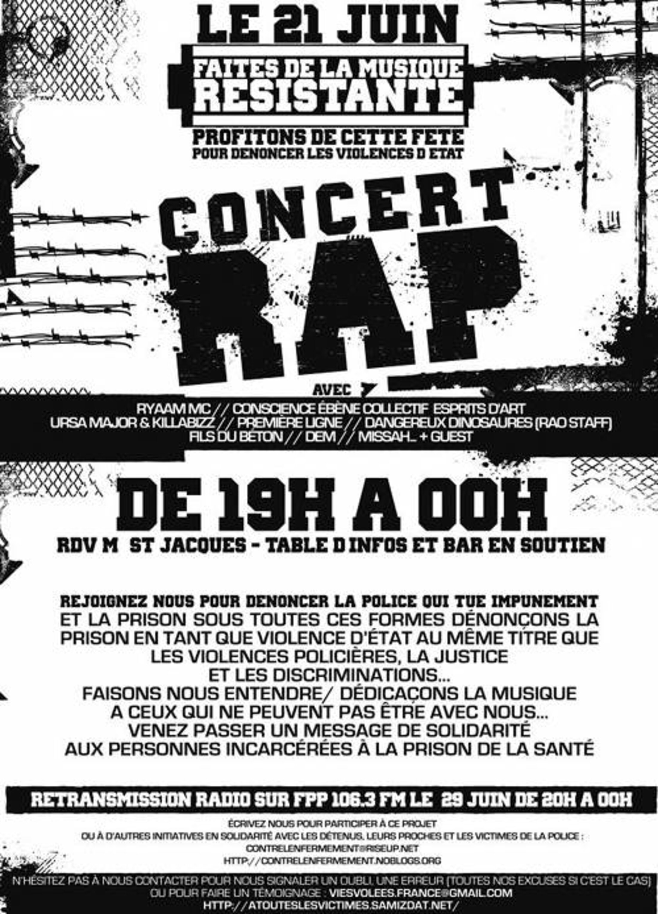 Profitons de cette fête pour dénoncer les violences d'état. Rejoignez-nous le 21 juin 2012 pour un concert Rap de 19h00 à 00h00 qui a pour but de donner de la visibilité aux victimes de violences d'état et de passer un message de solidarité aux personnes incarcérées à la prison de la santé. Parce que nous voulons dédicacer la musique à tous ceux qui ne peuvent pas être avec nous... qu'on nous a enlevé(e)s trop tôt, tué(e)s ou enfermé(e)s... Nous rendrons hommage aux familles, nous rendrons hommages aux victimes. Nous dénoncerons la police, nous dénoncerons les matons et la prison en tant que violence d'état. RDV vers la prison de la santé (Métro: Saint Jacques). Concert avec Première Ligne / Ursa Major & Killabizz / Fils du Béton / Missah / Dangereux Dinosaures (R.A.O. Staff) / Dem / Ryaam Mc / Conscience Ebène Collectif Esprits d'Art... Table d'infos et bar en soutien. Retransmission radio sur F.P.P - 106.3 FM - www.rfpp.net le 29 juin 2012 de 20h00 à 00h00. Ecrivez-nous pour participer à ce projet ou à d'autres initiatives en solidarité avec les détenus, leurs proches et les victimes de la police: contrelenfermement@riseup.net Site: http://contrelenfermement.noblogs.org