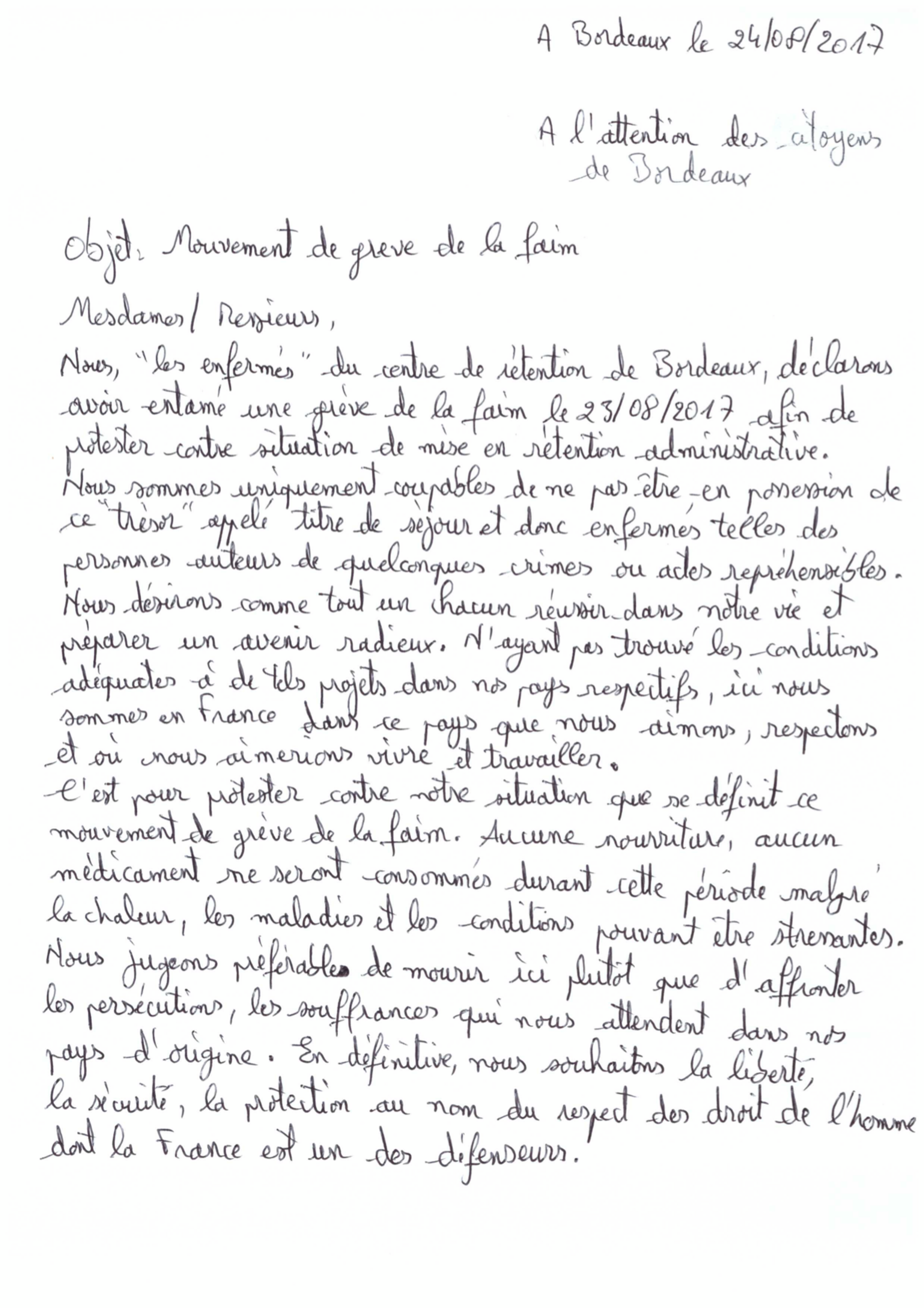 Ce même courrier a été transmis à la police aux frontières et aux intervenants du centre de rétention, aux avocats et bientôt aux institutions.