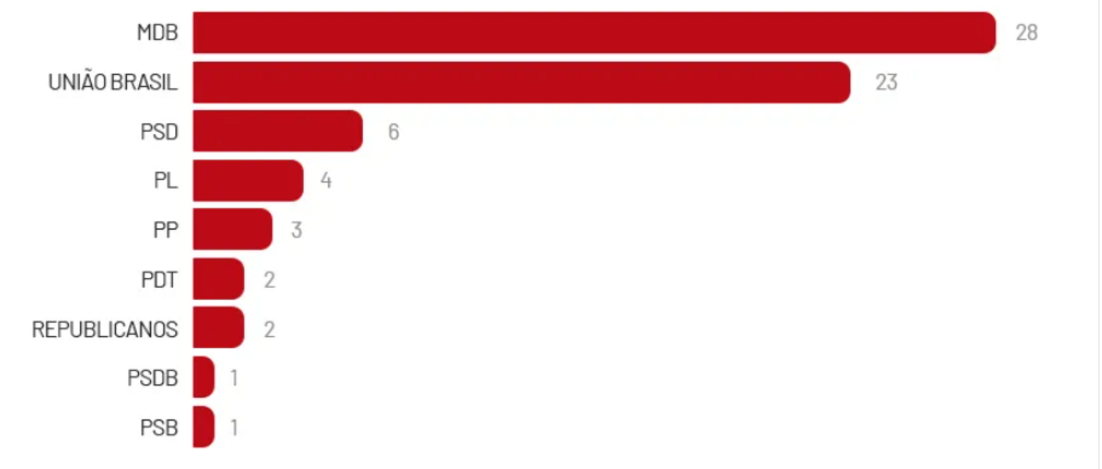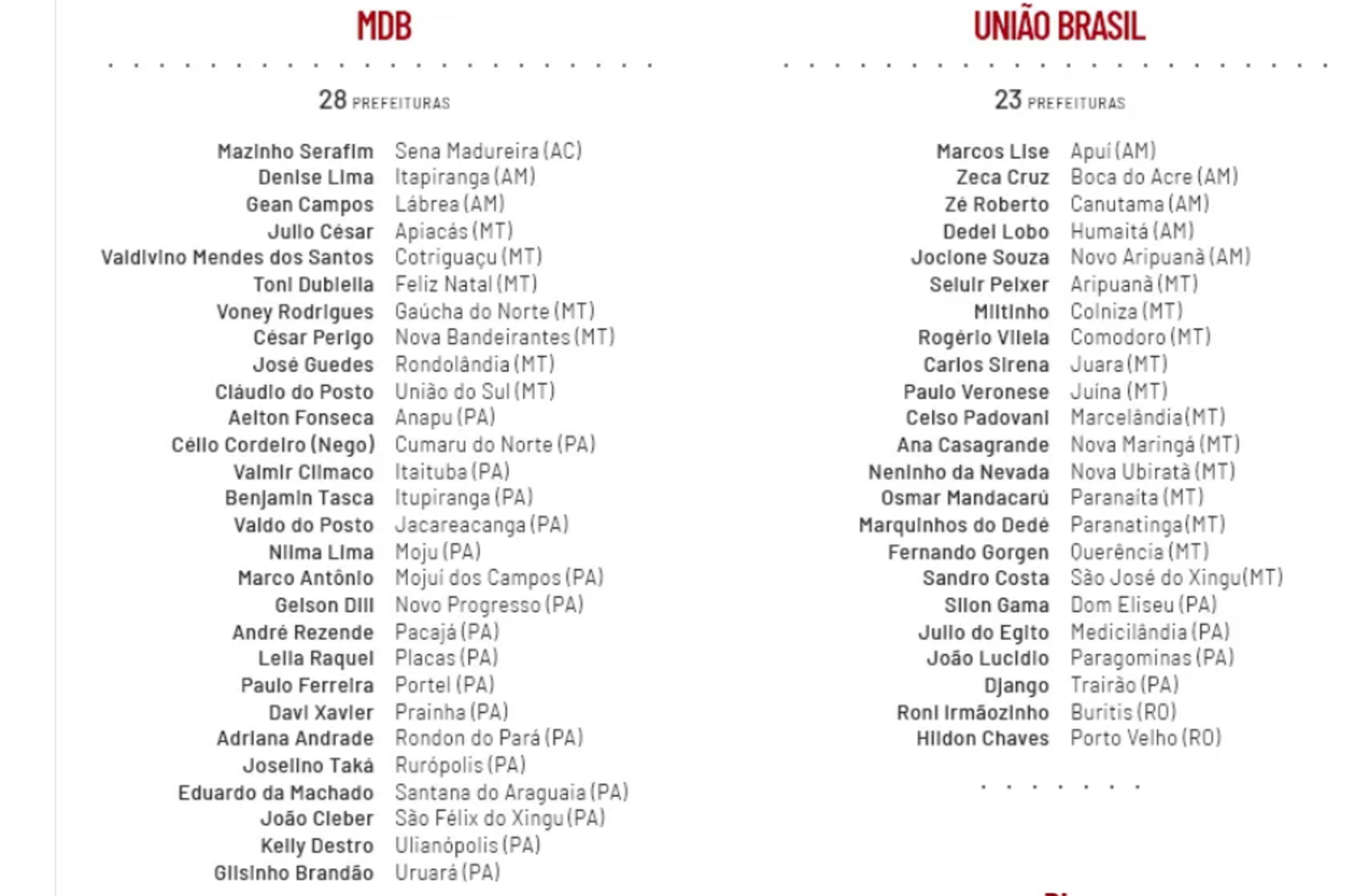 L'União Brasil, parti d'extrême droite, gouverne 23 municipalités de la liste, 12 dans le Mato Grosso, 5 dans l'Amazonas, 4 dans le Pará et 2 dans le Rondônia.