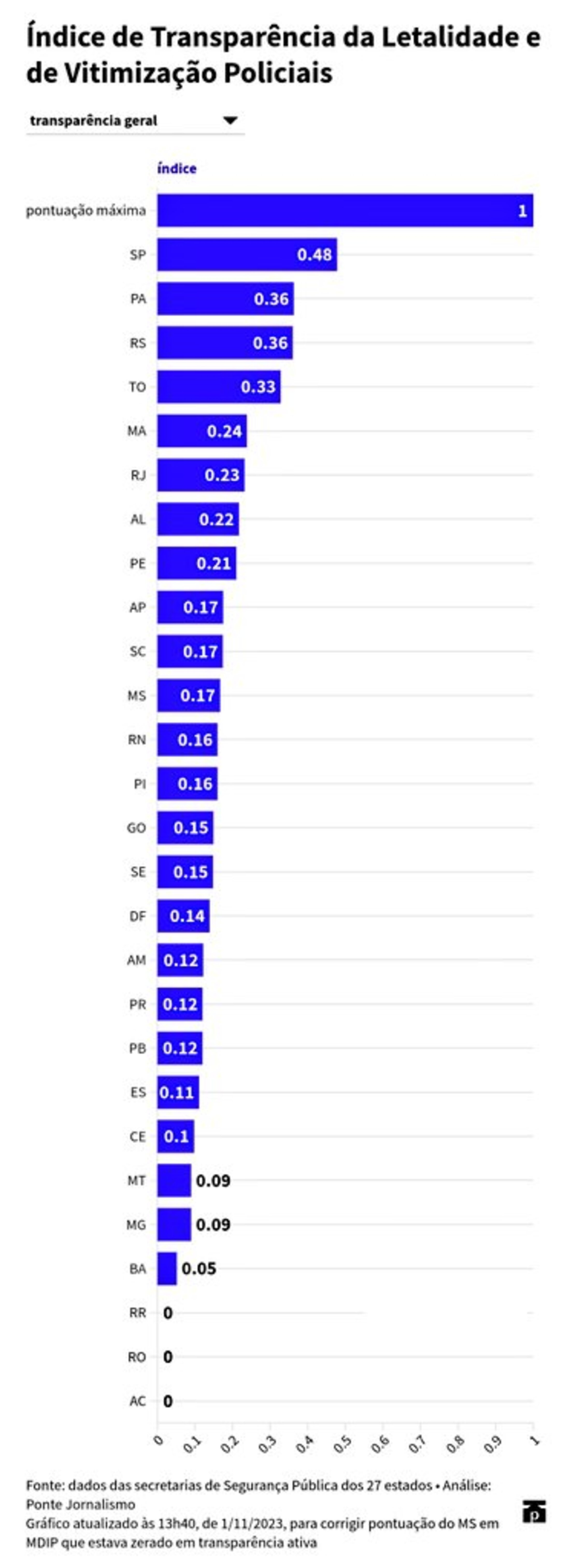 "En partenariat avec Rights & Security International (RSI), nous avons passé ces derniers mois à parcourir les sites web des Secrétariats à la Sécurité Publique à travers le Brésil, à faire des demandes de LAI et à trouver une boîte noire plus opaque que nous ne l'imaginions. Nous avons ainsi évalué la manière dont chaque Etat rend compte à la population de la manière dont la police tue et de la manière dont la police meurt. Et les conclusions ne sont pas très bonnes : trois États ont obtenu zéro, et la majorité absolue est loin de l'idéal de transparence.