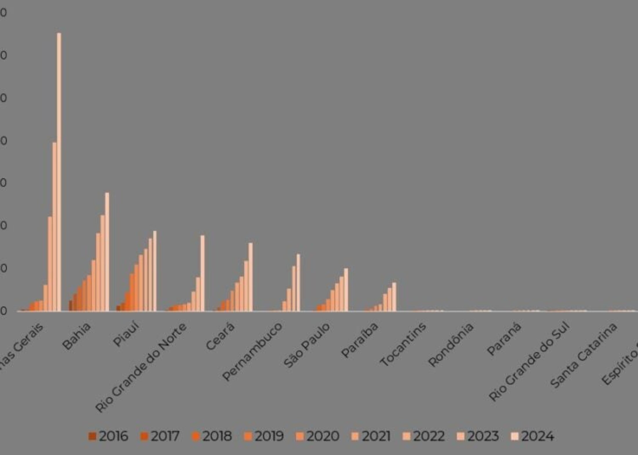 Au Brésil, ensemble, l'État du Minas Gerais, et trois des États du Nordeste que sont Bahia, le Piauí et le Rio Grande do Norte représentent 74 % de la superficie cartographiée avec des centrales photovoltaïques pour la seule année 2024, soit 25.900 hectares.