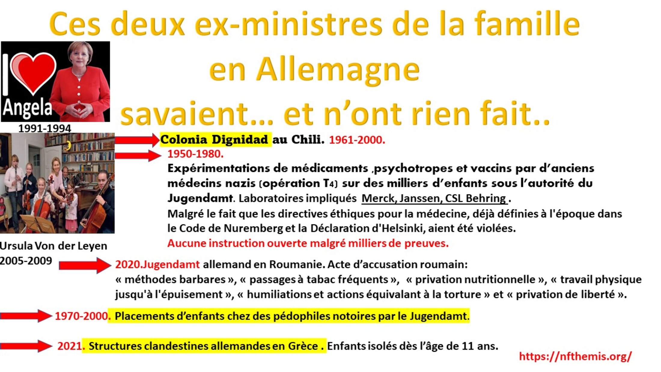 "Expérimentation de médicaments, psychotropes et vaccins sur des enfants ou nourrissons en institutions laïques ou religieuses menées par d’anciens médecins nazis (opération T4) des années 1950 à 1980 sous la supervision du Jugendamt. Laboratoires impliqués Merck, Janssen, CSL Behring et certainement d'autres.