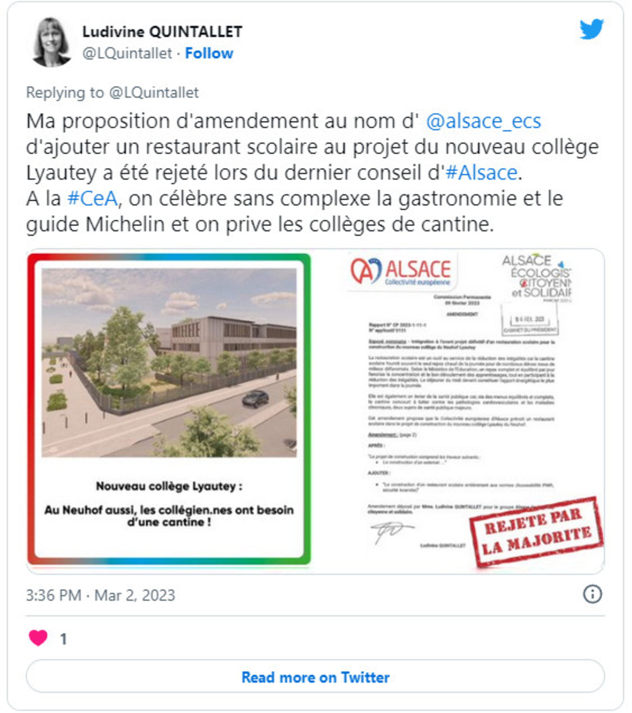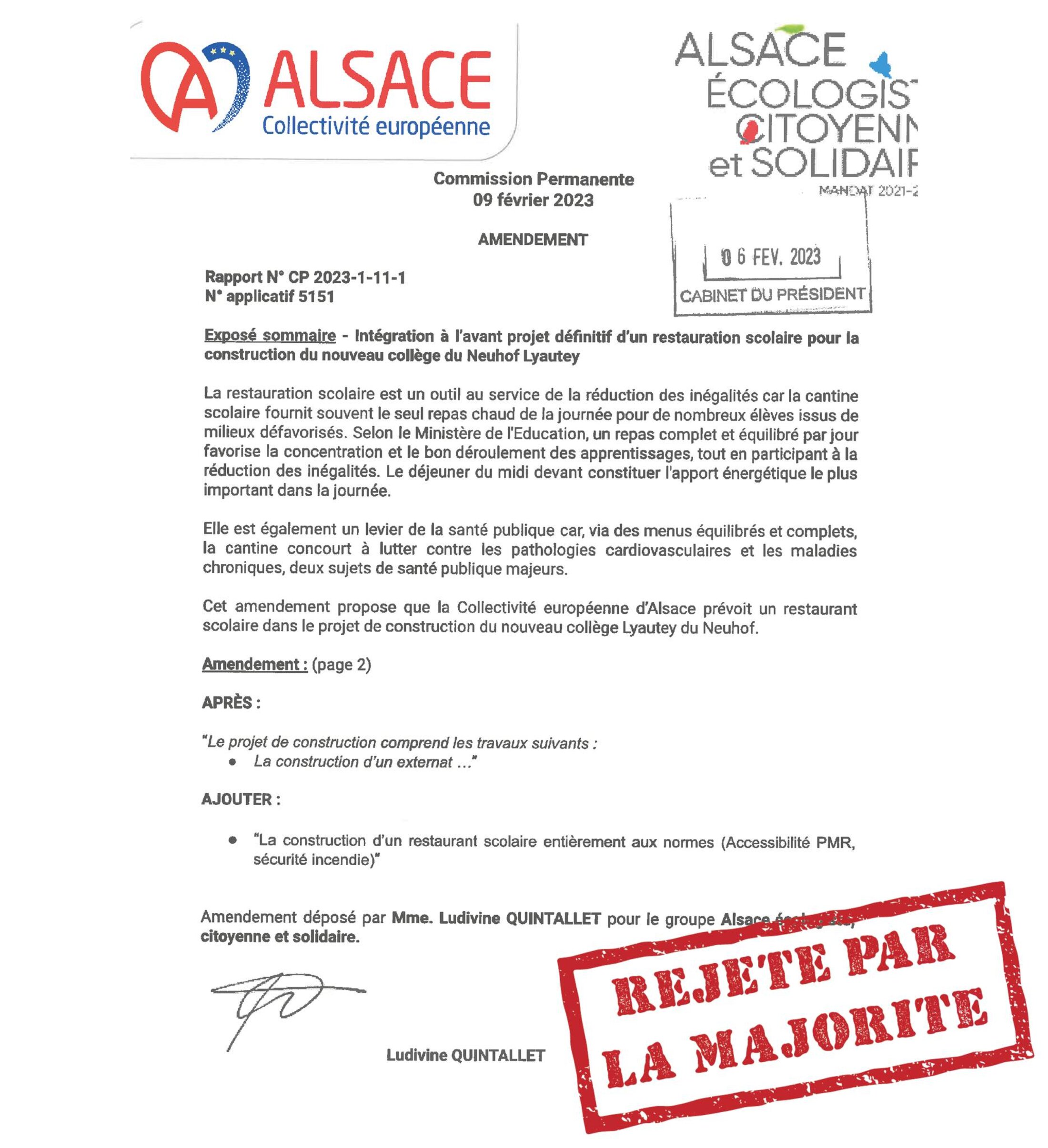 L'élue Ludivine Quintallet, conseillère d'Alsace, au nom de son groupe, a proposé un amendement de bon sens lors de ce conseil. Cet amendement proposait d'inclure un restaurant scolaire à ce projet. Le groupe majoritaire l'a rejeté.