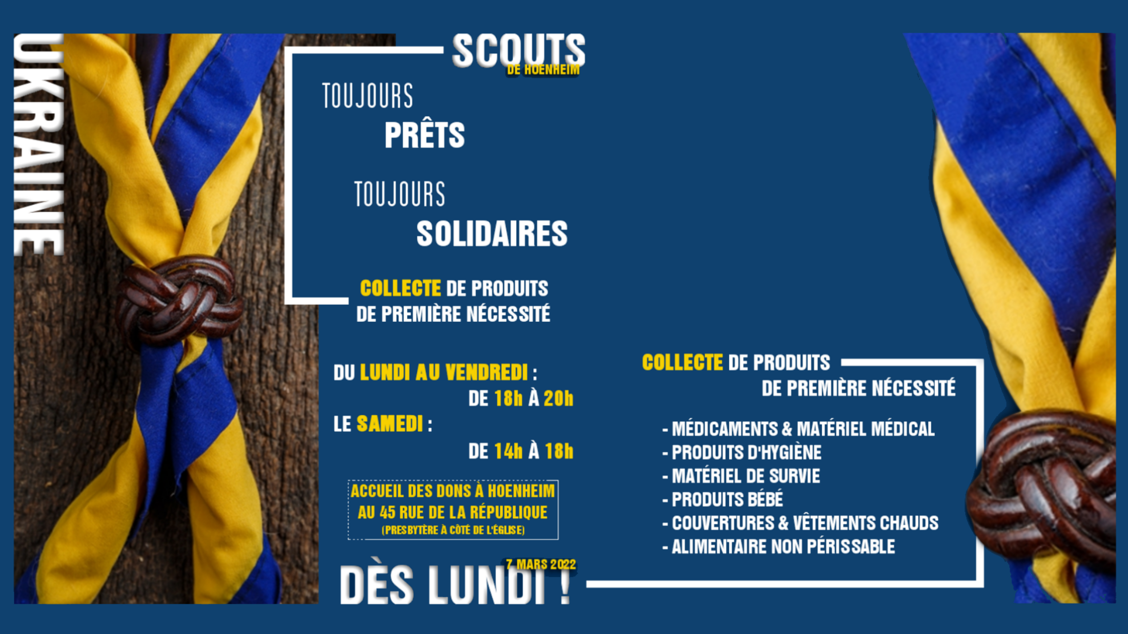 A Hoenheim (67), la section scout se mobilise pour venir en aide à la population ukrainienne. A partir du 7 mars, vous pourrez déposer vos dons pour l'Ukraine au 45 rue de la République (au presbytère) entre 18h et 20h. Voir les détails ci-dessous :