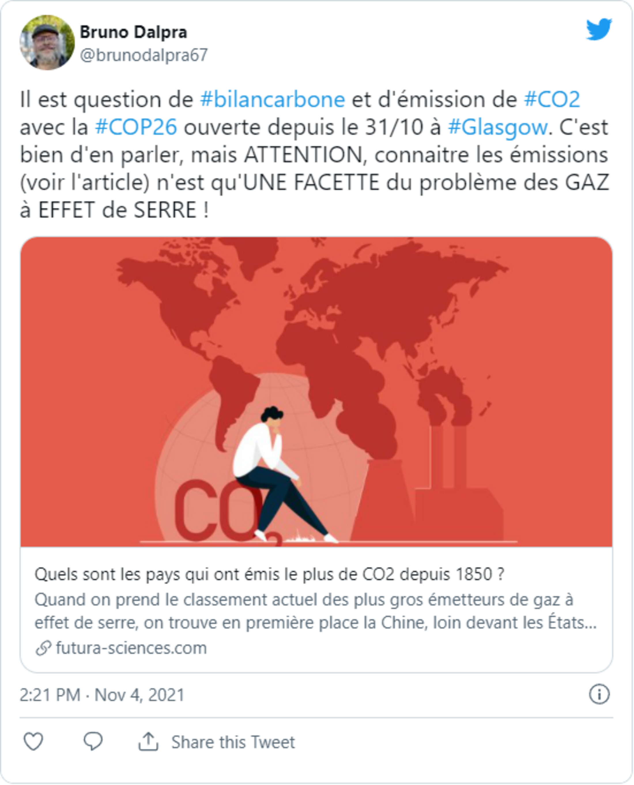 Dans la recherche d'une limitation du réchauffement climatique, les médias mettent en avant la nécessité de maitriser notre bilan carbone, c'est-à-dire de maitriser au mieux nos rejets en CO2. Or, le CO2 est une partie de l'iceberg. Le véritable enjeu est de réduire nos émissions de gaz à effet de serre (1).