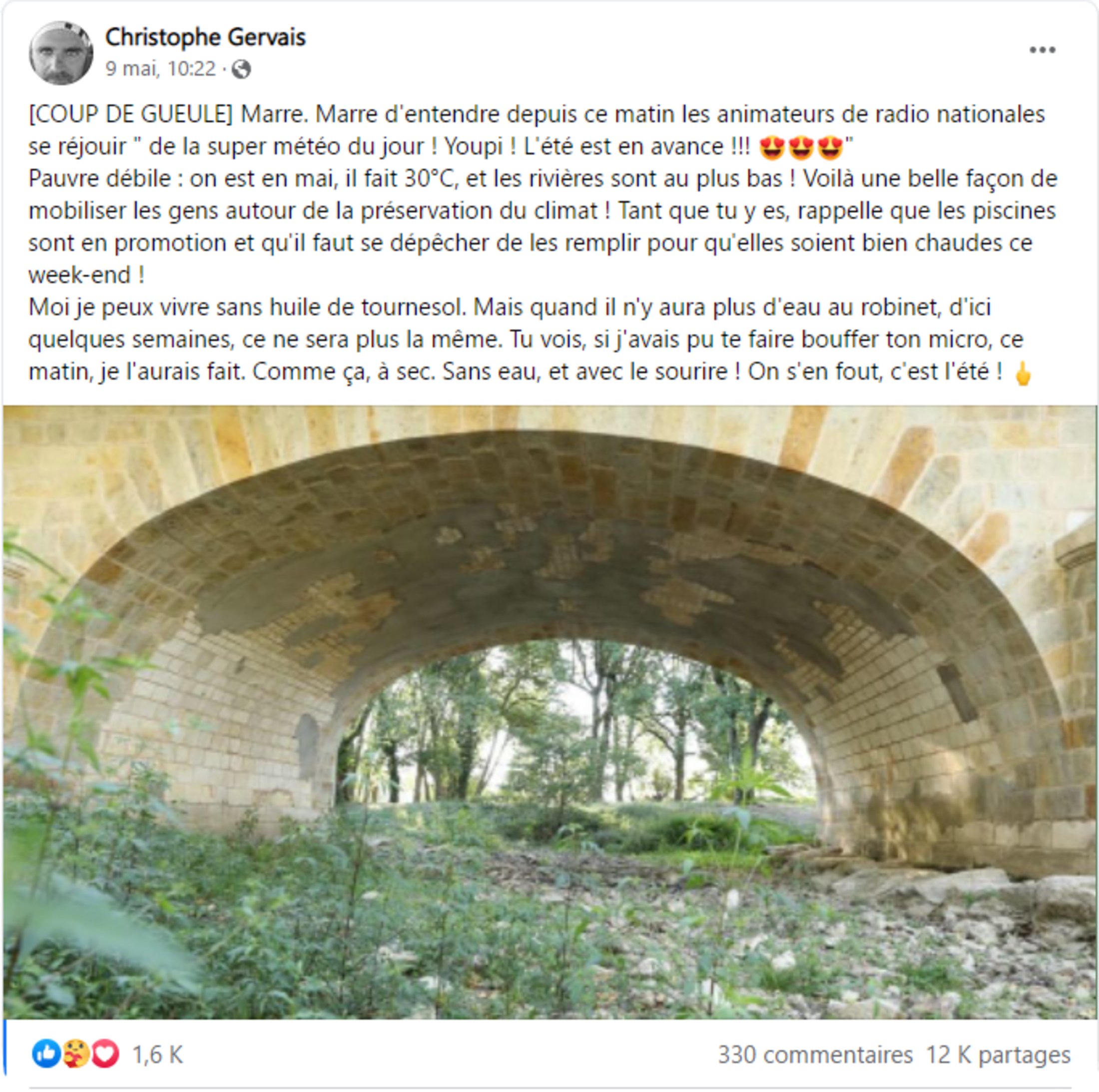 Pauvre débile : on est en mai, il fait 30°C, et les rivières sont au plus bas ! Voilà une belle façon de mobiliser les gens autour de la préservation du climat ! Tant que tu y es, rappelle que les piscines sont en promotion et qu'il faut se dépêcher de les remplir pour qu'elles soient bien chaudes ce week-end !