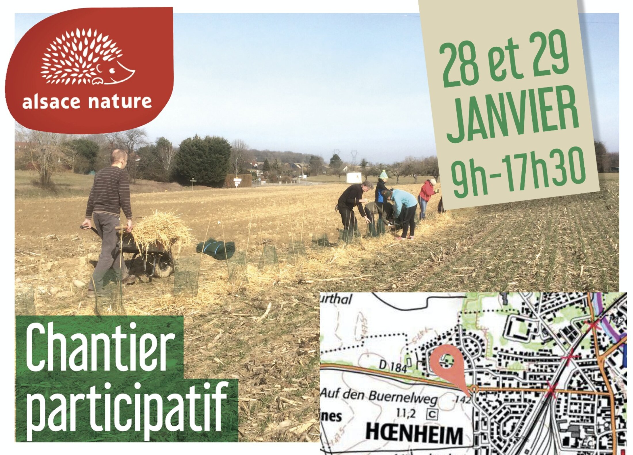Sur la commune de Hoenheim, au nord de l'Eurométropole de Strasbourg, un chantier participatif est organisé par les associations Alsace Nature et Haies Vives d'Alsace avec le soutien de la ville d'Hoenheim.