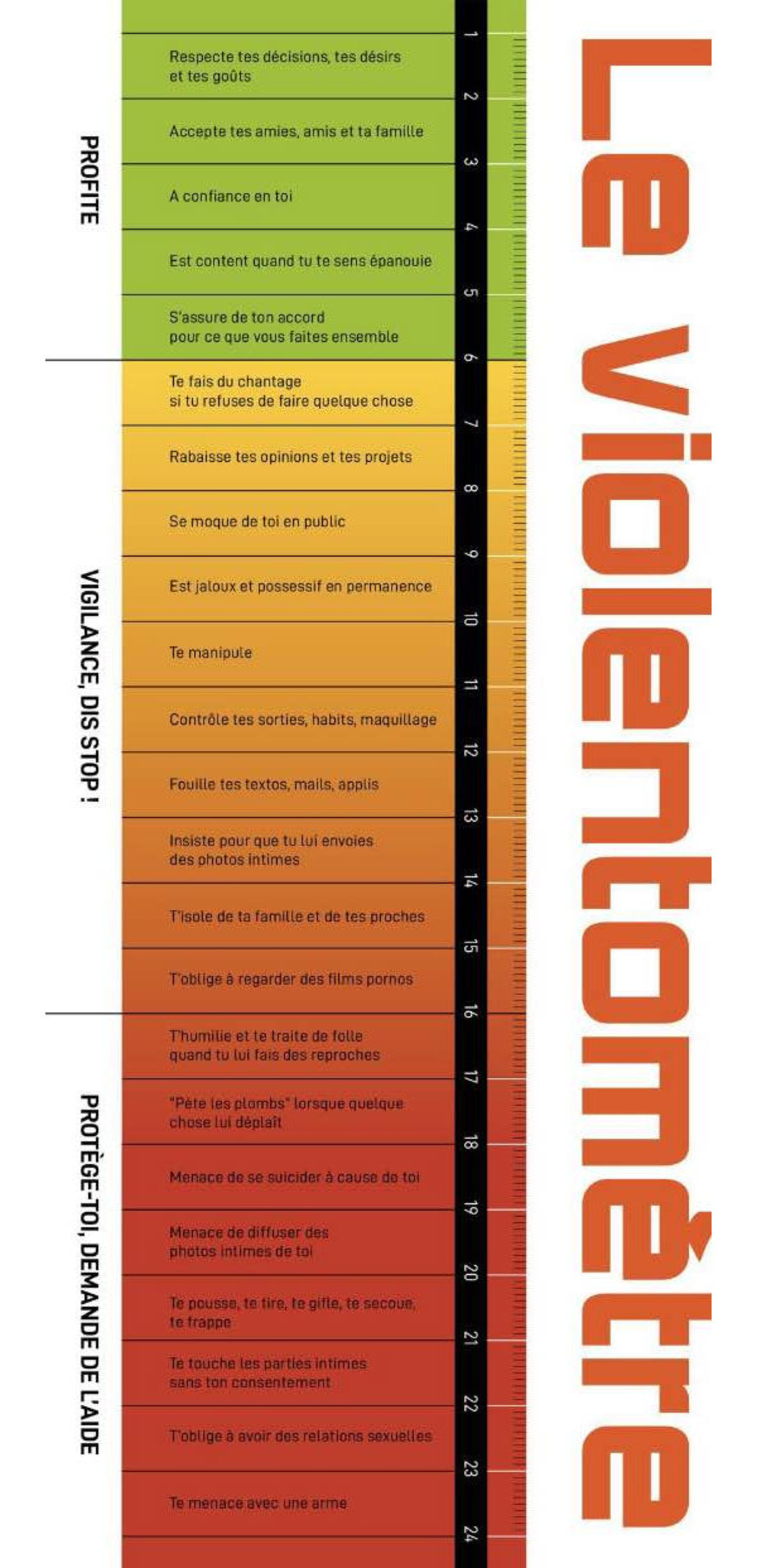 Intéressant outil graduel, ce violentomètre permet de mesurer le niveau de violence en fonction des situations et ainsi, pouvoir situer l'échelle de menace qui pèse sur la relation entre deux conjointes /conjoints dans un couple.