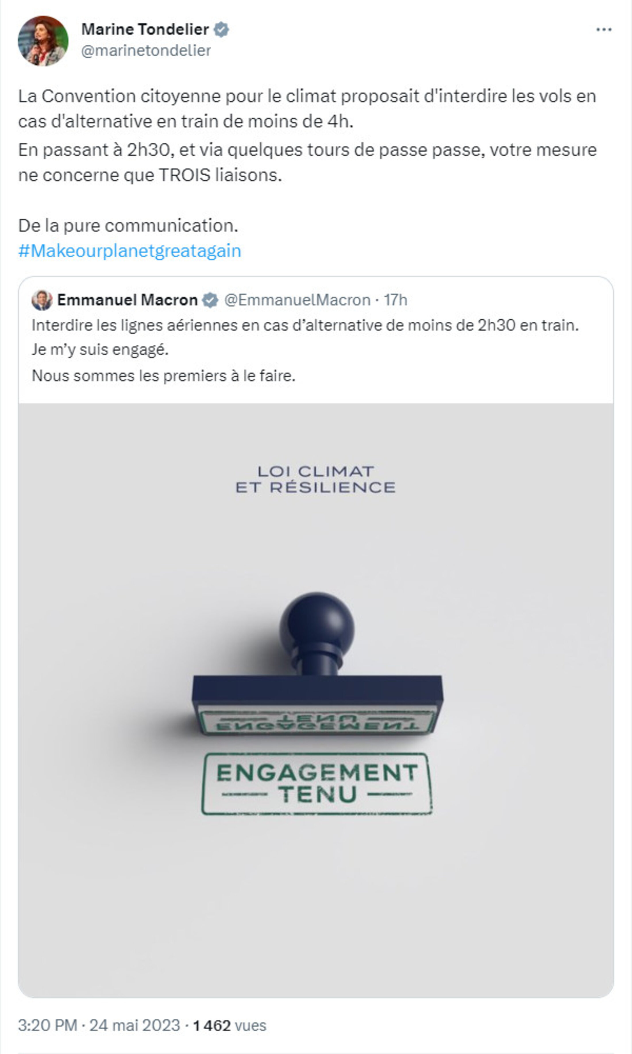 Ici, par exemple, Emmanuel Macron fait croire aux citoyens que la France agit pour le climat. En réalité, la mesure issue de la loi climat et résilience, mise en application pour interdire les vols en cas d'alternative en train de moins de 2h30, n'est pas ce que la Convention citoyenne pour le climat avait proposé. La Convention proposait « de moins de 4h ». Dans la version du gouvernement, seules trois lignes sont concernées.