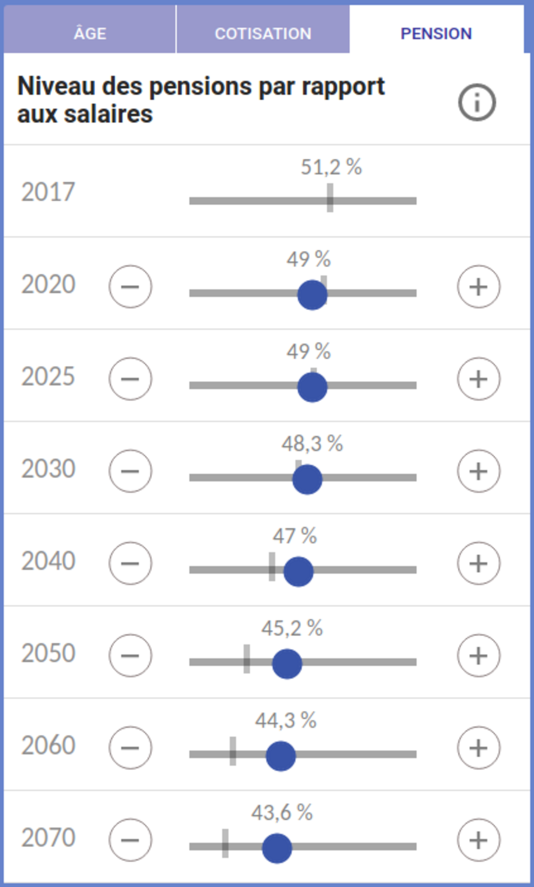 On nous demande ensuite de choisir pour 2020, 2025, etc. le taux de cotisation, l'âge de départ à la retraite, et le niveau des pensions par rapport au salaire et instantanément, le site nous fournit l'évolution de la situation financière du système et du niveau de vie des retraités.