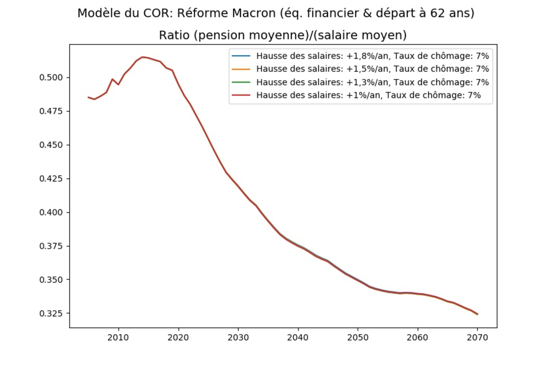 et d'en déduire (automatiquement) le niveau des pensions par rapport au salaire moyen et le niveau de vie des retraités par rapport à celui de la population. Nous faisons toujours cette simulation sous l'hypothèse de travail (contestable) du gouvernement de ne pas toucher au taux de cotisation. Voilà ce qu'on obtient pour l'ensemble des projections économiques du COR à horizon 2070: