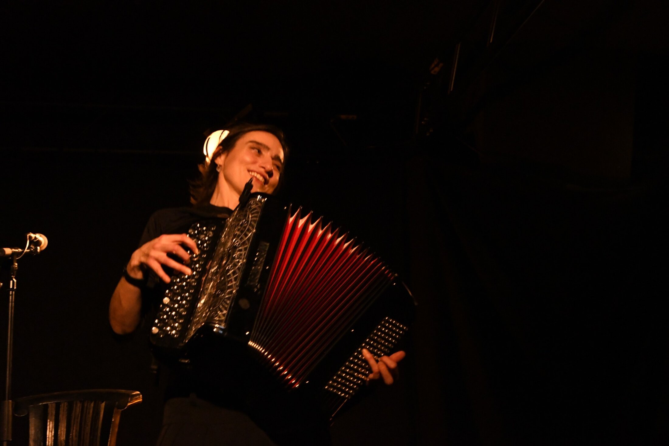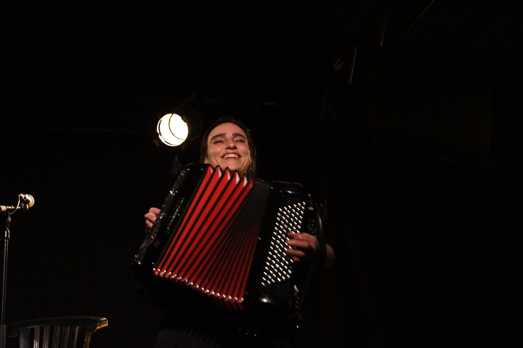 Justine Jérémie, toute de noir vêtue, cachée derrière son accordéon, noir lui aussi, illumina notre soirée. Fragile en apparence, semblant s'excuser de nous prendre un peu de notre temps. Elle se présente sur la pointe de ses chausses, soulève péniblement son instrument qui fera corps avec elle, métamorphosant la jeune femme en une artiste confirmée.