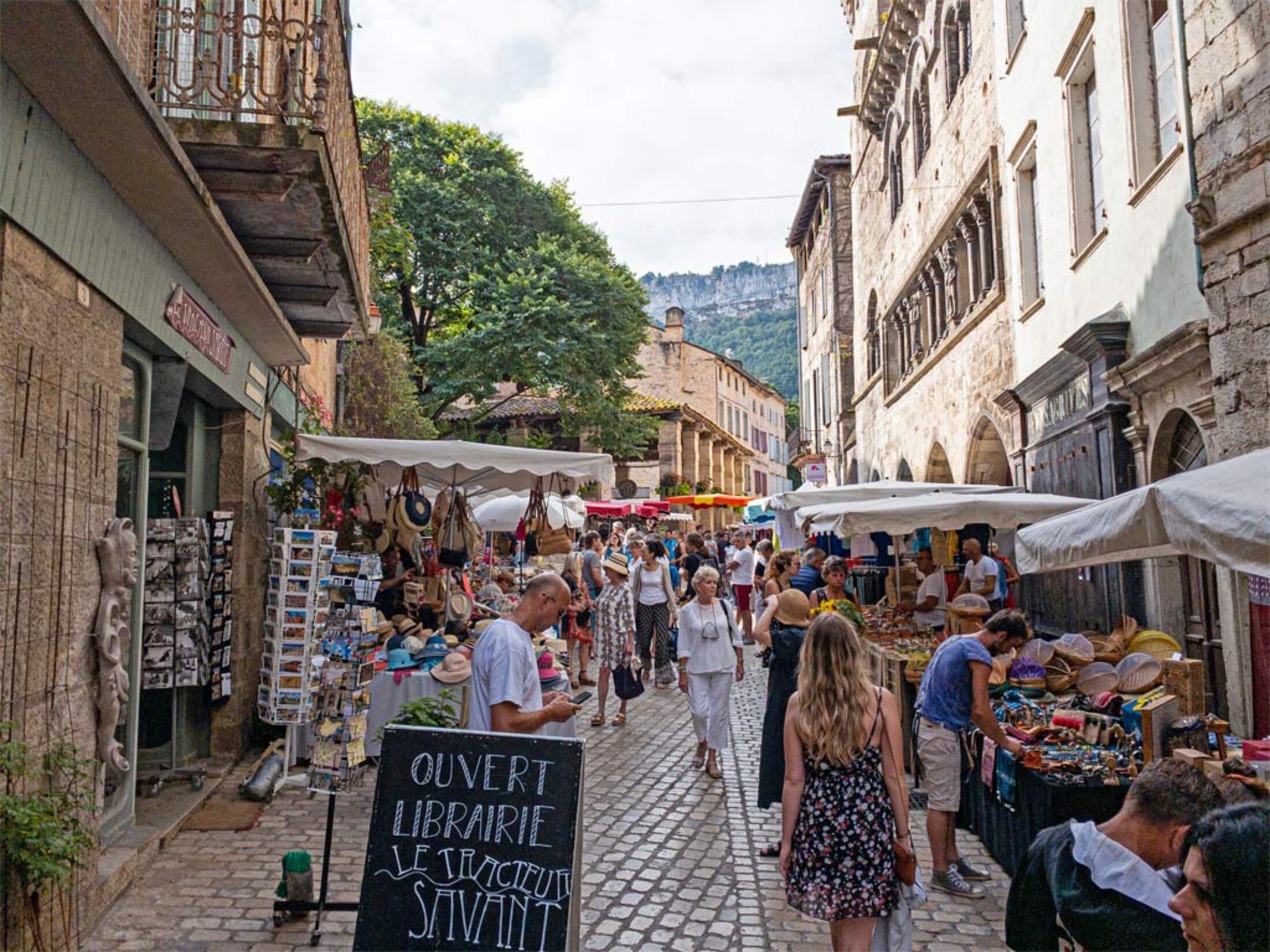 Il est neuf heures trente et déjà la foule se presse dans les ruelles étroites de Saint-Antonin-Noble-Val. Il faut jouer des coudes pour se frayer un passage ; chacun ayant pris les devants pour faire les commissions avant les fortes chaleurs promises pour la journée. Le marché est à la hauteur de ce somptueux village lové contre les gorges de l'Aveyron. Rues en pentes, pavées, halle, monuments très anciens, petits ruelles transversales et tunnels couverts donnent un charme incomparable dans ce qui constitue un des plus beaux marchés de France.