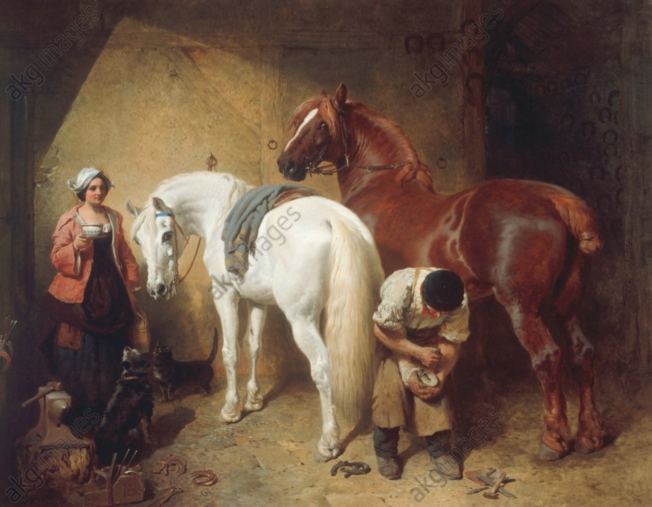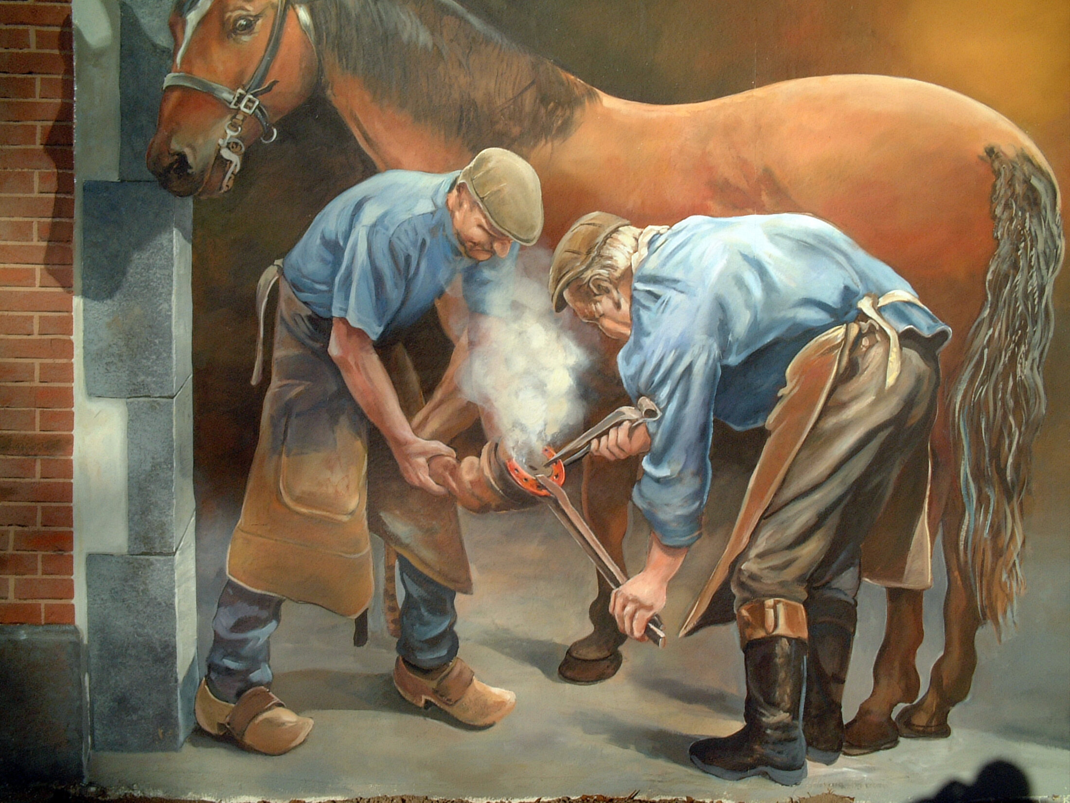 Peu de temps plus tard, dans la même ferme, le maréchal ferrant vint comme à son habitude ferrer les chevaux de traits de l'exploitation. C'était une époque où la seule force animale venait en aide aux travaux des champs. Les bêtes avaient l'habitude de se voir ainsi dotées de renforcements métalliques sous leurs sabots. Cependant, l'inconfort de la situation déplaisait fortement à une jument qui à grands hennissements tenta d'exprimer son ressentiment à l'artisan.