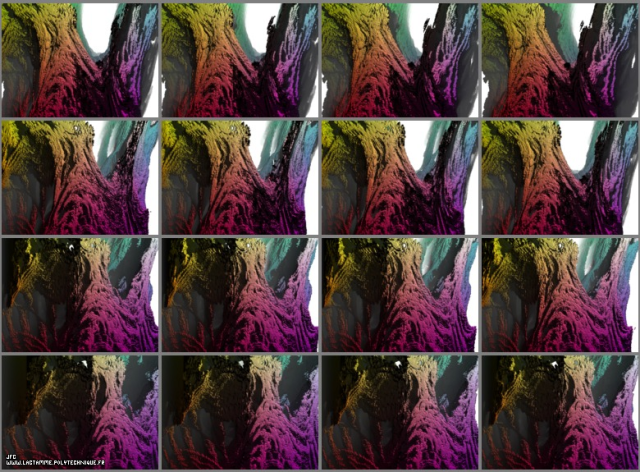 En mathématique,la rotation autour de l'axe Y (vertical) d'un ensemble de Mandelbrot peut être vue comme un ensemble de 4x3 stéréogrammes. Cependant, si vous regardez cette image comme un stéréogramme en vision parallèle (3D), vous compterez 20 éléments 5 horizontaux X 4 verticaux) au lieu de 16 en vison normale.