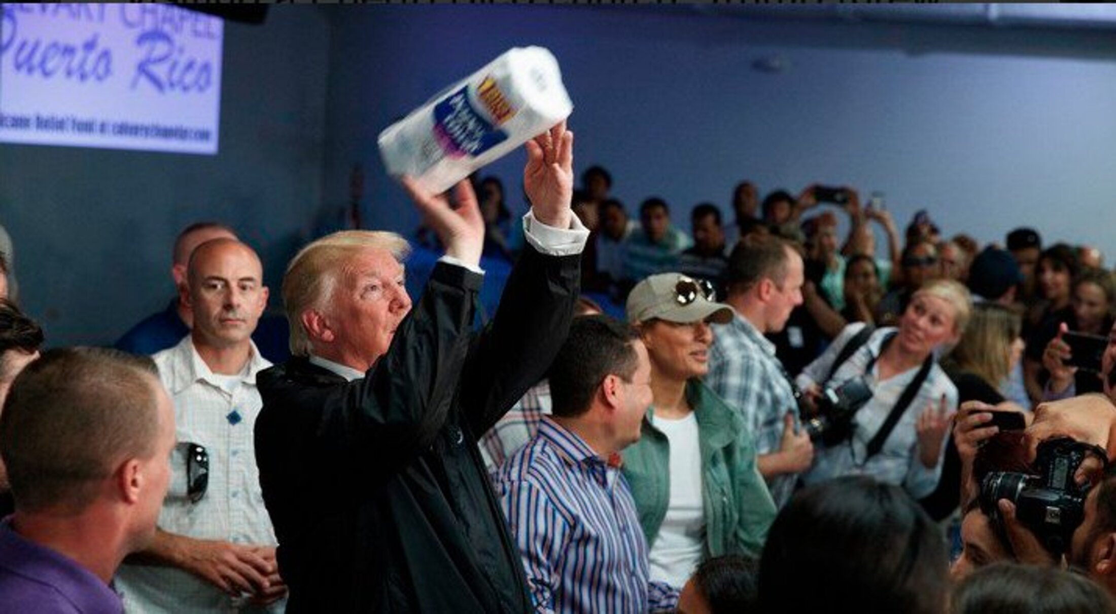 En visite le 3 octobre à Puerto Rico, le président étasunien s’est encore fait remarqué dans une distribution organisée de vivres et matériel aux sinistrés, où il s’est mis à lancer des rouleaux d’essuie-tout comme s’il était sur un terrain de basket. L’opération, qui devait servir avant tout à redorer son image suite aux critiques sur la gestion de la situation d’urgence, a finalement prouvé au monde son manque d’intérêt et d’empathie pour la population portoricaine. Et ça ne s’est pas arrêté là : dans une table ronde rassemblant des responsables locaux, il a ouvertement critiqué leur gestion de la crise : « Ça m’embête de vous dire ça, Porto Rico, mais vous avez mis notre budget sens dessus dessous ». Et il a poursuivi en minimisant la situation, la comparant avec l’ouragan Katrina, « une vraie catastrophe » selon ses dires |3|.