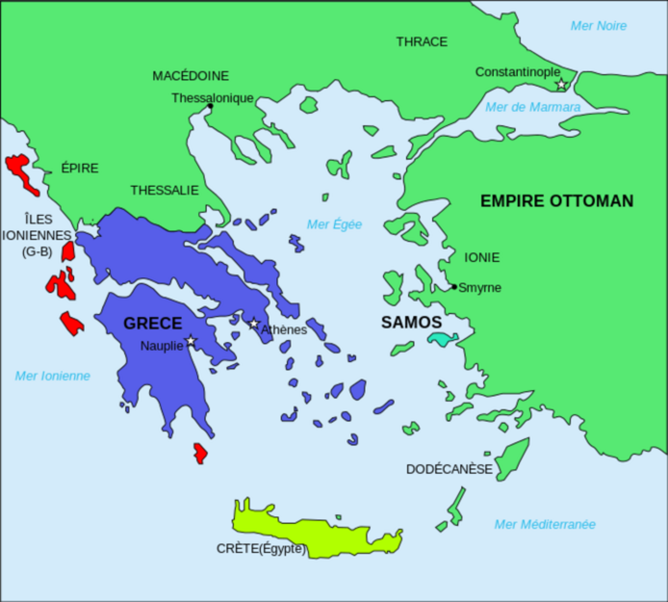 Le point culminant de ce processus fut la révolution grecque de 1821. Mais si les Grecs remportèrent des succès considérables lors des premières années de lutte, l’armée turco-égyptienne, après avoir été réorganisée, réussit à gagner par la suite des batailles décisives qui, sur l’échiquier politique, annulèrent l’avantage pris par les Grecs. En 1827, la révolution – qui n’avait touché que les îles de la mer Égée, le Péloponnèse et la partie sud de la péninsule (Sterea Hellas) – était à l’agonie.