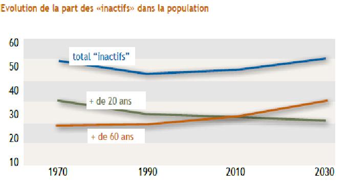 Et en fait qu'en est-il de cette théorie du vieillissement de la population qui nous amènerait irrémédiablement vers une société en pleine déliquescence ? Premièrement, il s'agit de projections, par définition invérifiables (puisque futuristes), et il ne s'agit pas d'un « choc démographique » mais d'une évolution régulière. Deuxièmement, on sait que la génération des « baby-boomers » tant décriée n'existera tout simplement plus après 2050 (et que les générations suivantes ont eu un niveau de natalité bien moindre). Troisièmement, l'usage des termes « vieillissement de la population » n'est pas neutre, aujourd'hui nous ne sommes plus vieux à 60 ans, et tant mieux ! Les tenants de cette théorie aime d'ailleurs à oublier que si l'espérance de vie a augmenté c'est aussi parce qu'on a amélioré les conditions de travail et instauré un système de retraites convenable, justement. Quatrièmement, les « actifs » (20-60 ans) ne vont pas diminuer mais bien les « inactifs » de moins de 20 ans (qu'on prend rarement en compte, préférant insister sur la catégorie des plus de 60 ans). Pour 100 « actifs », il y avait 100 « inactifs » en 1970, il y en aura 105 en 2030.6