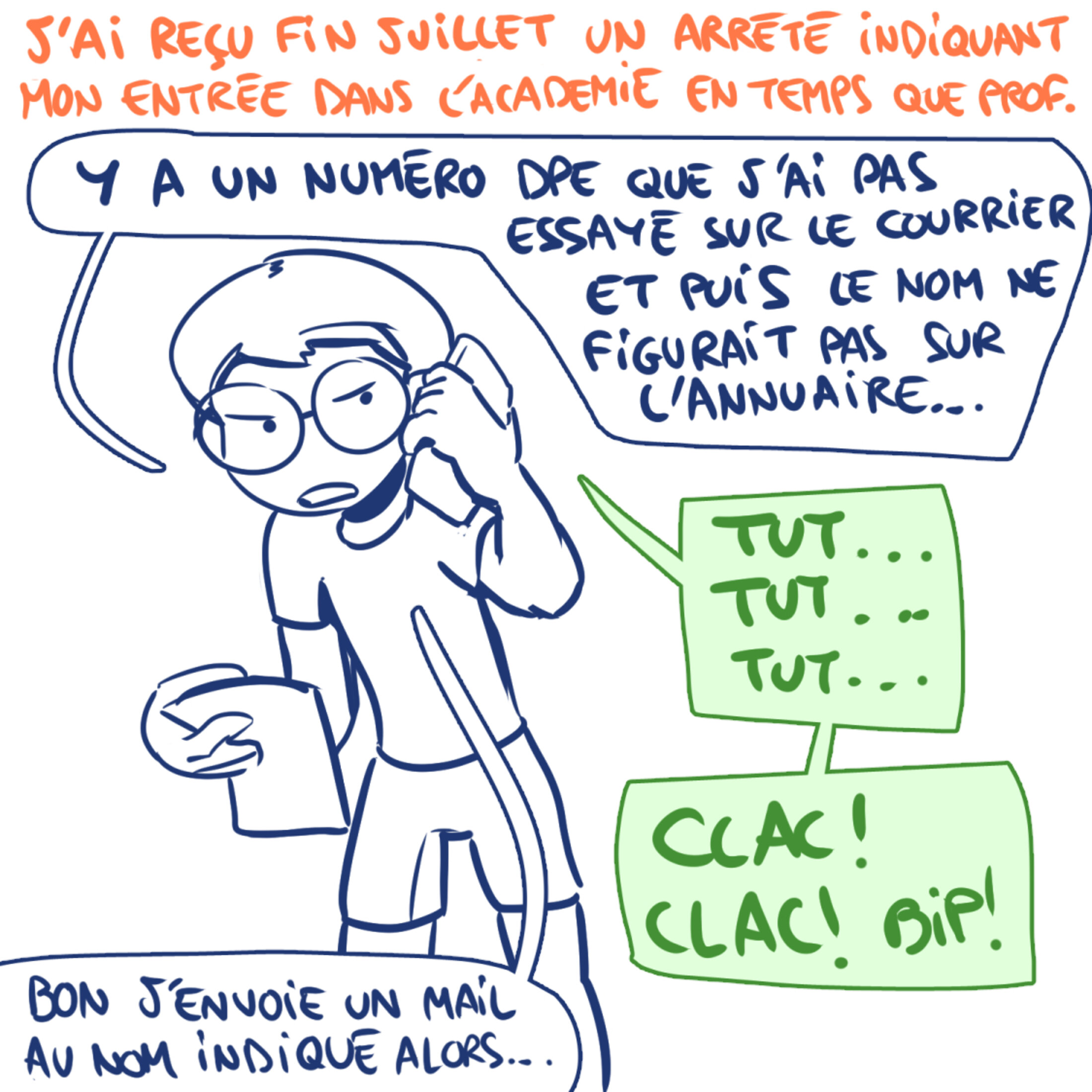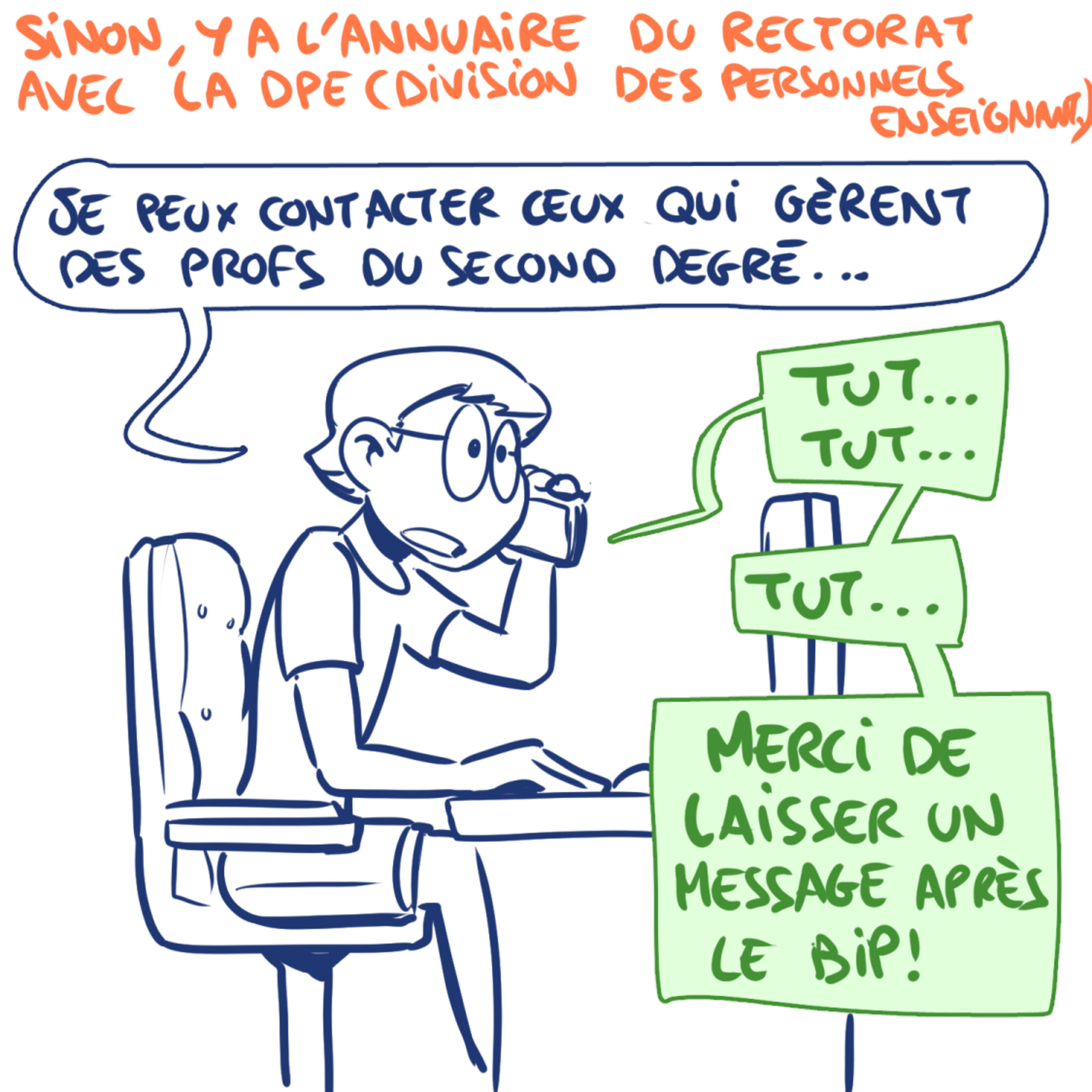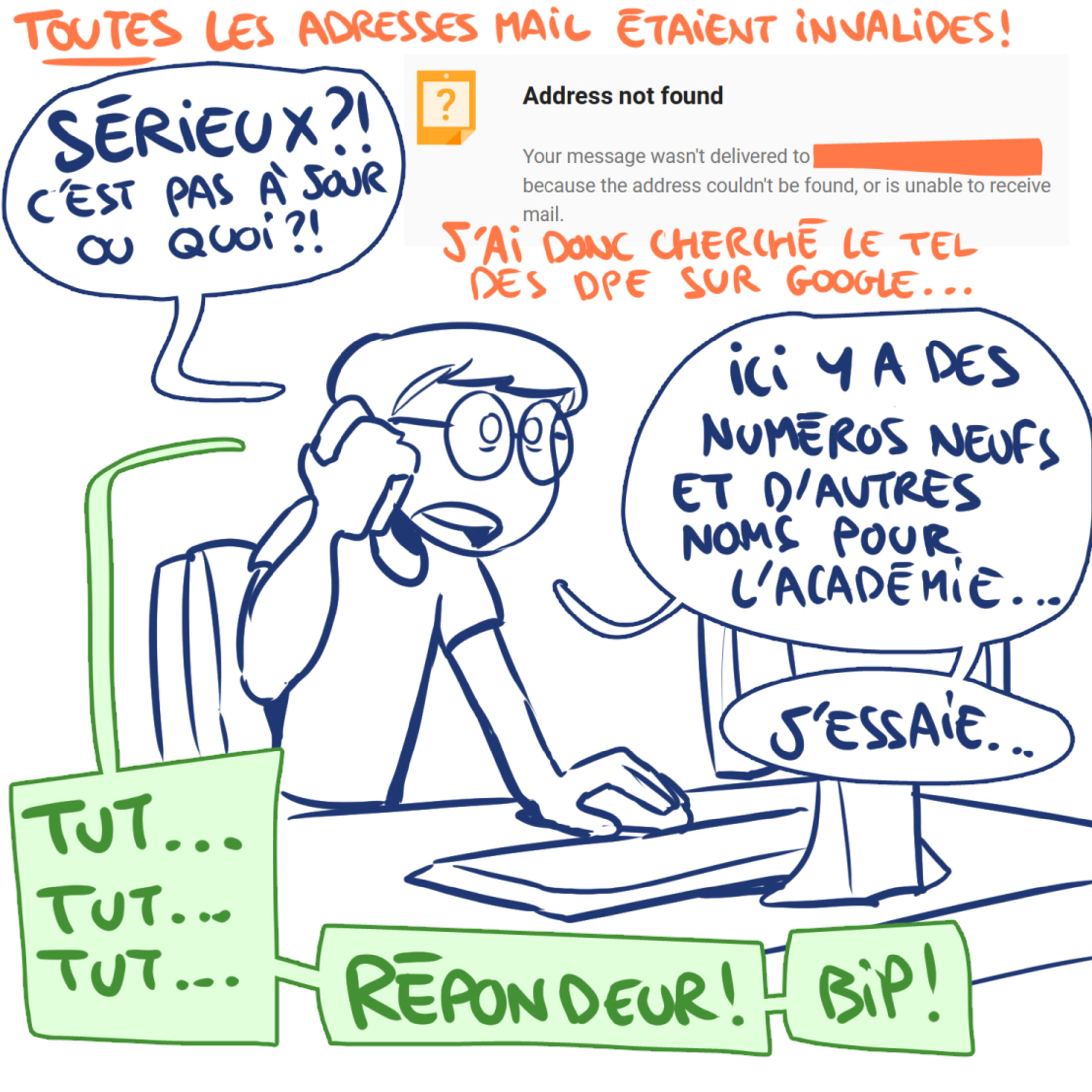 (Bien sûr la liste des démarches décrites ci-dessus n'est pas exhaustive : j'ai essayé de contacter plus de monde (gestionnaire i-prof ; proviseur de mon établissement de RAD ; contact de personnels RH divers et variés...). Heureusement aussi, des collègues se sont manifestés pour m'aider et me soutenir, mais ils n'en savent en général pas plus que moi ! )