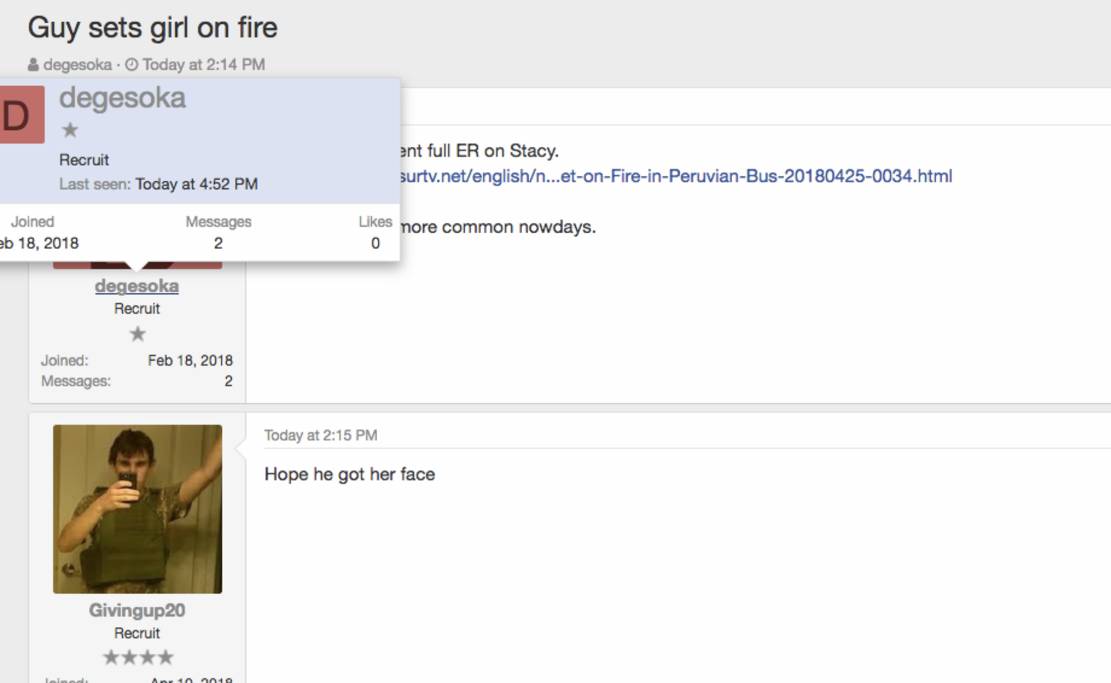 Le 24 avril dernier à Lima, Eyvi Agreda, une jeune péruvienne de 22 ans, était brûlée vive par un ancien compagnon de travail alors qu’elle se trouvait dans un bus et rentrait tranquillement chez elle. L’agression, qui a au passage touché une dizaine de personnes en plus d’Eyvi, est restée relativement inaperçue, l’attaque de la veille à Toronto ayant occupé la plupart des grands médias. Elle n’a cependant apparemment pas échappé à la sphère des incels, comme le montre un fil de discussion ouvert aujourd’hui sur le site incels.me intitulé « guy sets girl on fire » (un gars met une fille en feu). Alors que ce titre, qui peut être compris au sens propre et figuré, se présente déjà en lui-même comme l’affichage du caractère profondément violent à l’égard des femmes, le commentaire d’un certain « Givingup 20 » suffit, si preuve était besoin, à donner le ton, par un simple et concis « hope he got er face » (j’espère qu’il a atteint son visage)[1].