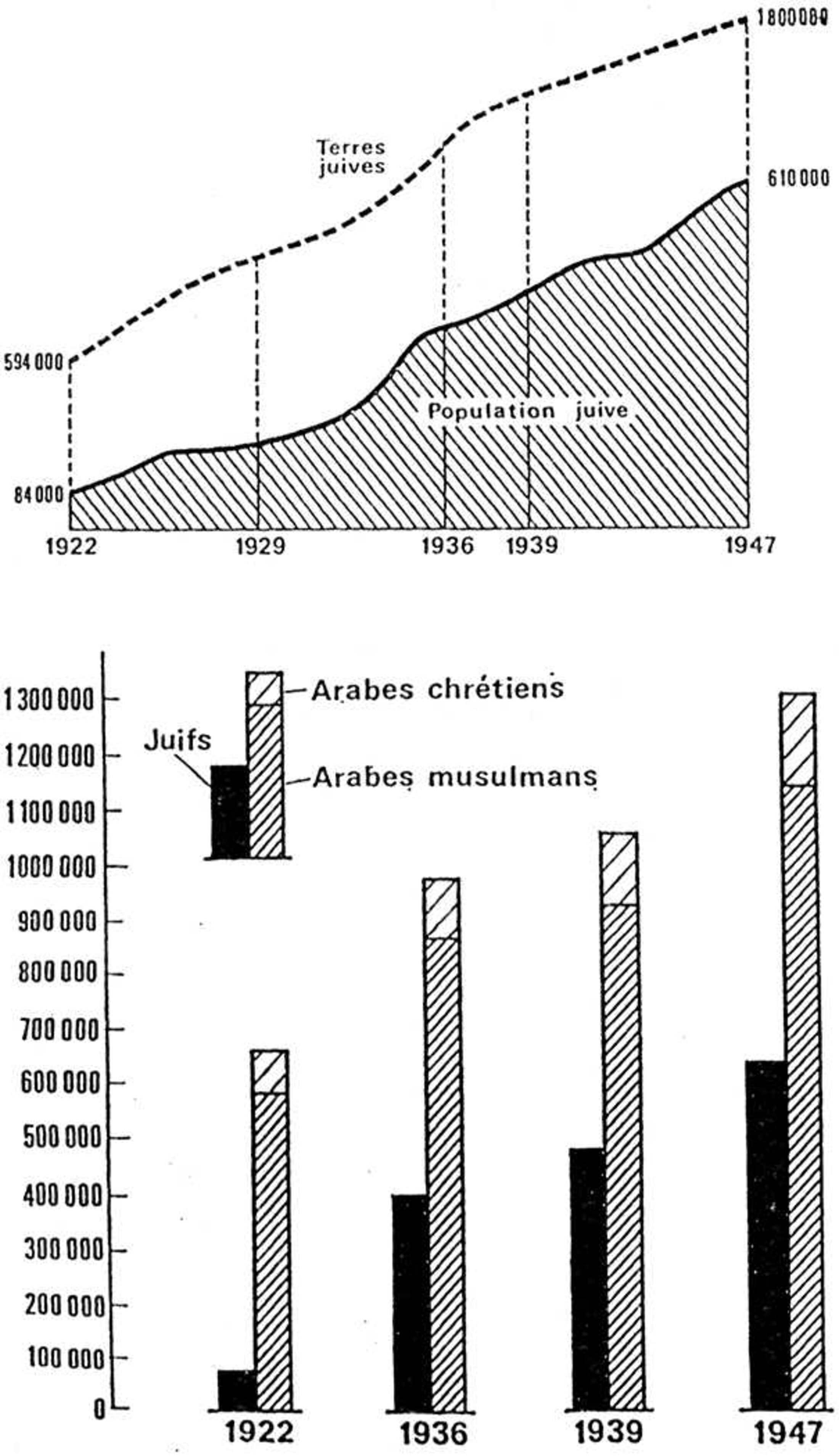 Cette colonisation de peuplement se conjugue à une colonisation foncière. De 218.000 dunums de terres en 1900, on passe à 400.000 en 1908 (Encel, 2006 : 233), puis environ 600 à 650.000 en 1920, 1.200.000 vers 1930, 1.500.000 en 1939 et enfin, 1.625.000 à 1.800.000 en 1947, soit 12 à 14 % des terres cultivables (Origines et Évolution du problème palestinien, Nations-Unies, 1990 ; Perrin, 2000).