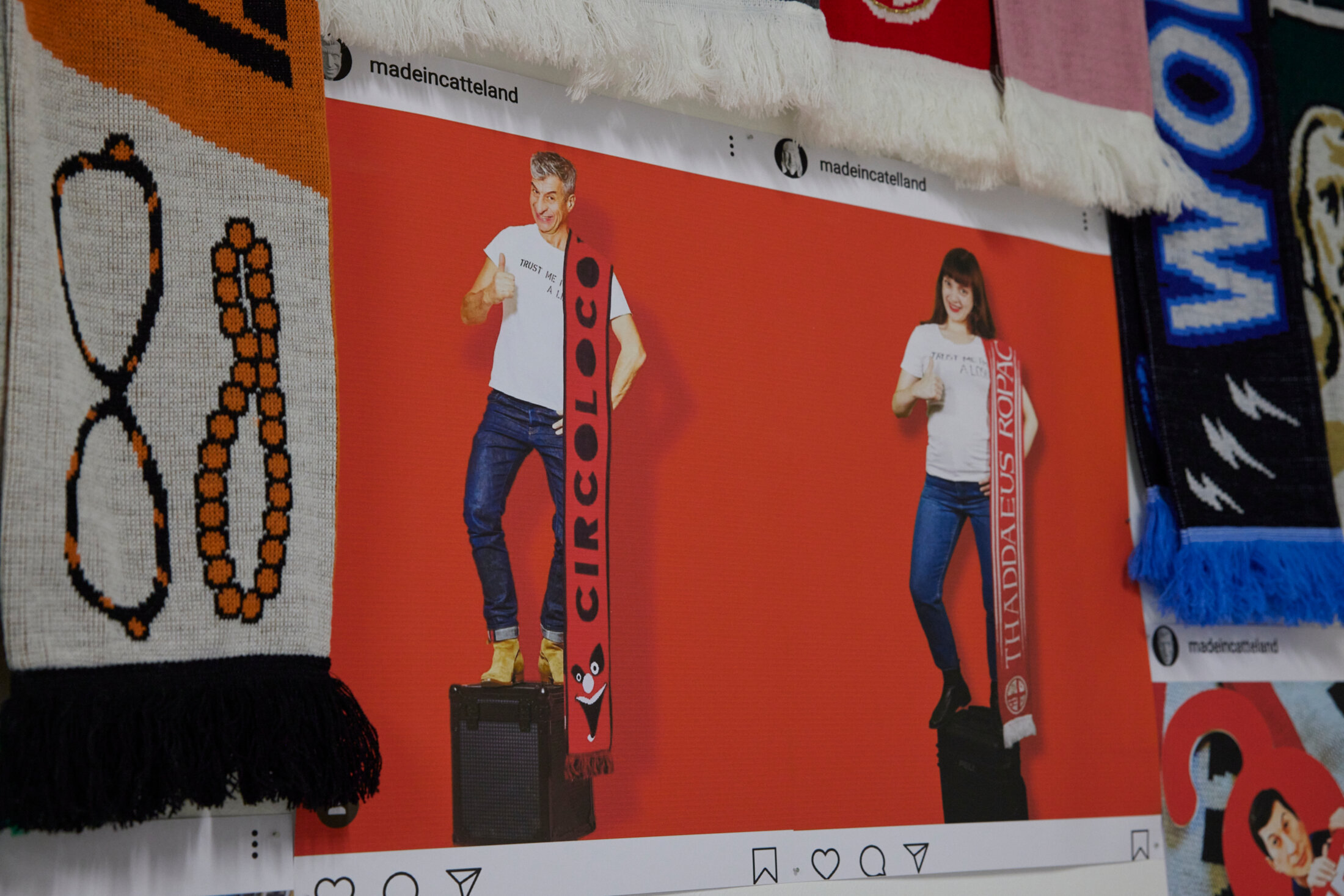 De plus, quelques mois après que Maurizio Cattelan a sorti sa marque d’écharpes, il a sorti un compte instagram qui s'appelait “Made in Catteland”, sur lequel il faisait la promotion de ses écharpes, avec des photos de lui au sein des institutions où il les vendait. Il avait demandé aux gens qui achetaient ces écharpes de se faire photographier avec. Du coup, j’ai décidé de faire ma propre version de son compte instagram “Made in Catteland”, avec mon prénom catel, avec un légère différence, lui c’est cattel avec deux T un L, moi c’est catell avec un T deux L. Je voulais presque faire le fake de sa marque, plagier son plagiat. Ce qui est assez drôle, c'est que lui, par exemple en lançant cette marque d'écharpe, il a créé en parallèle ce qu’il appelle la “museums league” afin de démocratiser l’art et le statut de « collectionneur », en disant “tout le monde pourra devenir collectionneur d’art en collectionnant mes écharpes”. D’un point de vue sociologique, c’est plus compliqué que ça. Tout le monde ne peut pas rentrer dans un musée déjà et tout le monde ne peut pas dépenser 50 dollars pour une écharpe de “collectionneur d’art”.