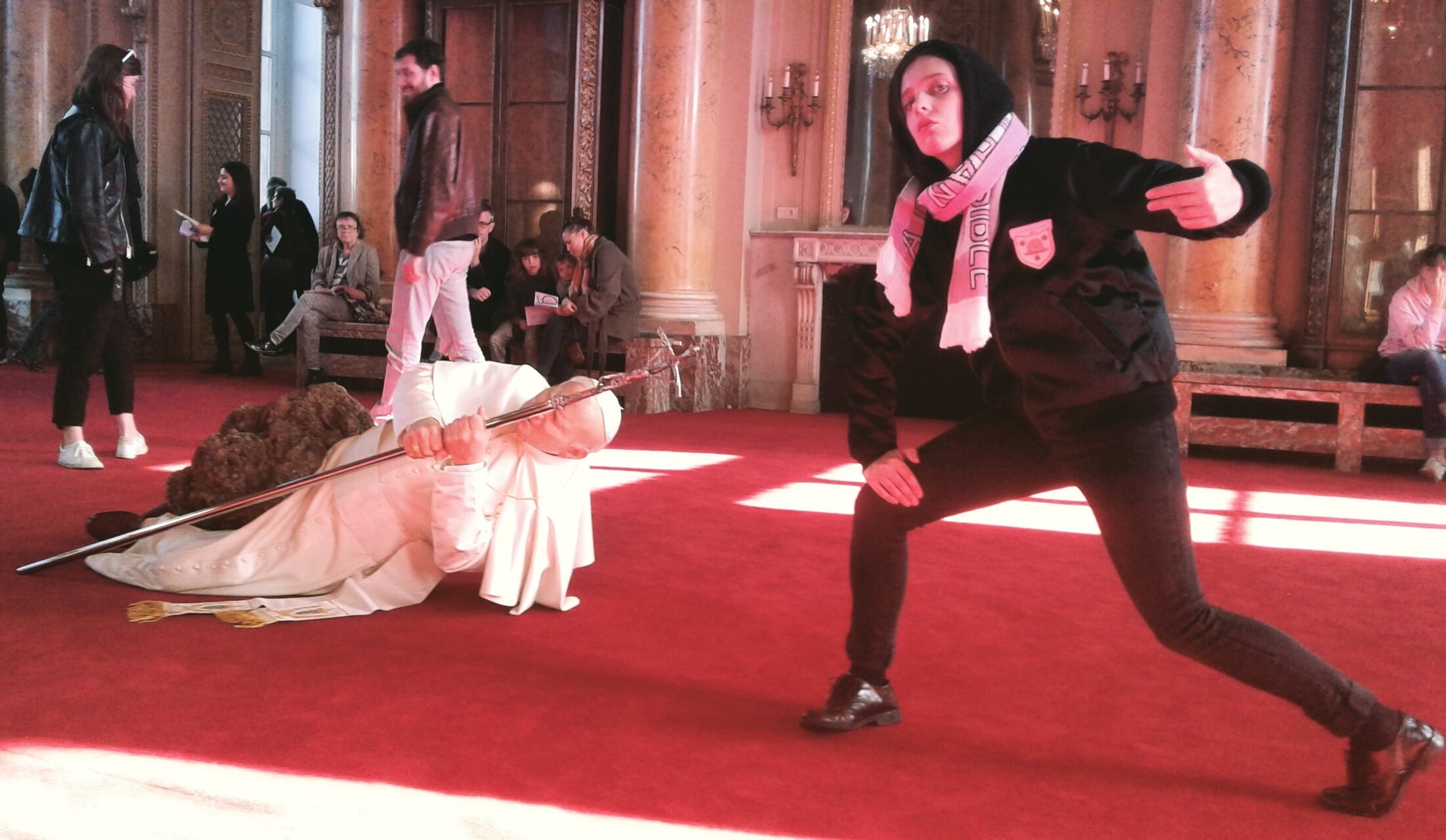 Étant donné qu'il est chez Perrotin, j’avais une écharpe et un bomber Perrotin. Je suis entrée et je me suis faite prendre en photo devant ses œuvres. Le lendemain, j’ai fait la même chose à la FIAC. J’ai été soutenir d'abord Kamel Mennour. Donc j’avais des bandes dorées sur le visage, une main en mousse de supporter. Et après j’ai été me changer dans les toilettes, un peu en mode incognito, il y avait la sécurité qui me suivait. J’ai donc mis ma panoplie de supporter de chez Perrotin. J’ai été devant sa galerie. J’ai sauté avec mon écharpe et je suis repartie. J’ai tagué tout le monde en diffusant mes photos sur les réseaux sociaux: la galerie Perrotin, Maurizio Cattelan & co. En octobre 2017, à peu près un an après, j’ai découvert que Maurizio Cattelan m’avait plagié.