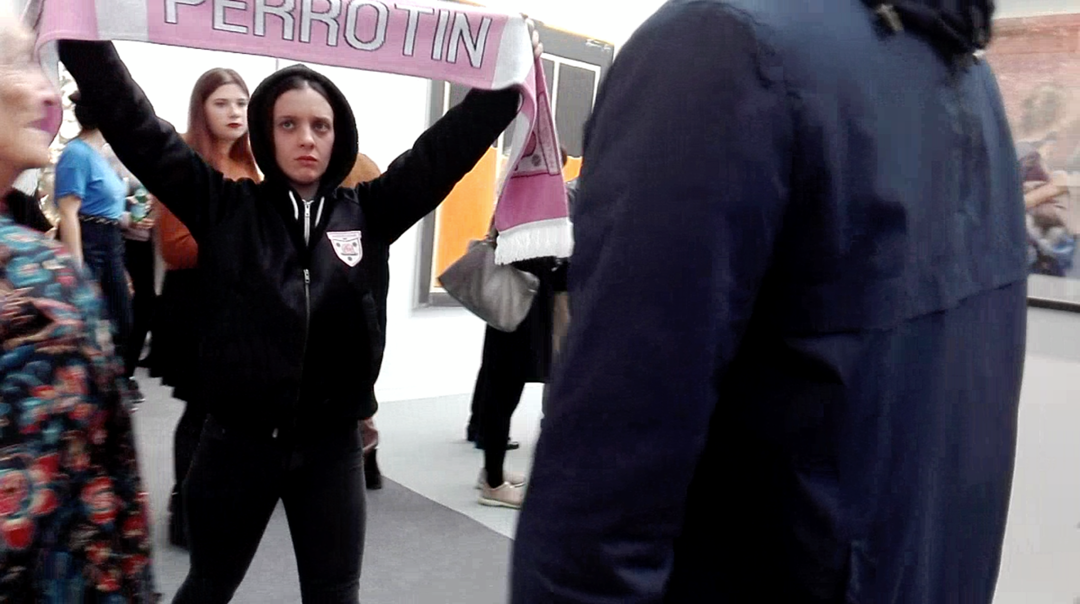 J’ai commencé ensuite à faire des performances dans des institutions qui exposaient les artistes de ces galeries. Je m'y rendais en tant qu'hooligan. Par exemple, si c’est un artiste de chez Kamel Mennour qui expose, j’y vais en tant qu’hooligan de Kamel Mennour. Si c’est un artiste de chez Perrotin, j’y vais en hooligan de Perrotin. Évidemment, je ne demande pas la permission au musée. Lorsque je suis sur place, soit je prends juste des photos avec des postures de supporters virils à côté des œuvres avec mes écharpes, soit je crie et chante le slogan de la galerie. La première performance de ce genre que j’ai faite, c’était en 2016, pendant l’exposition « Not Afraid Of Love » de Maurizio Cattelan, à la Monnaie de Paris.