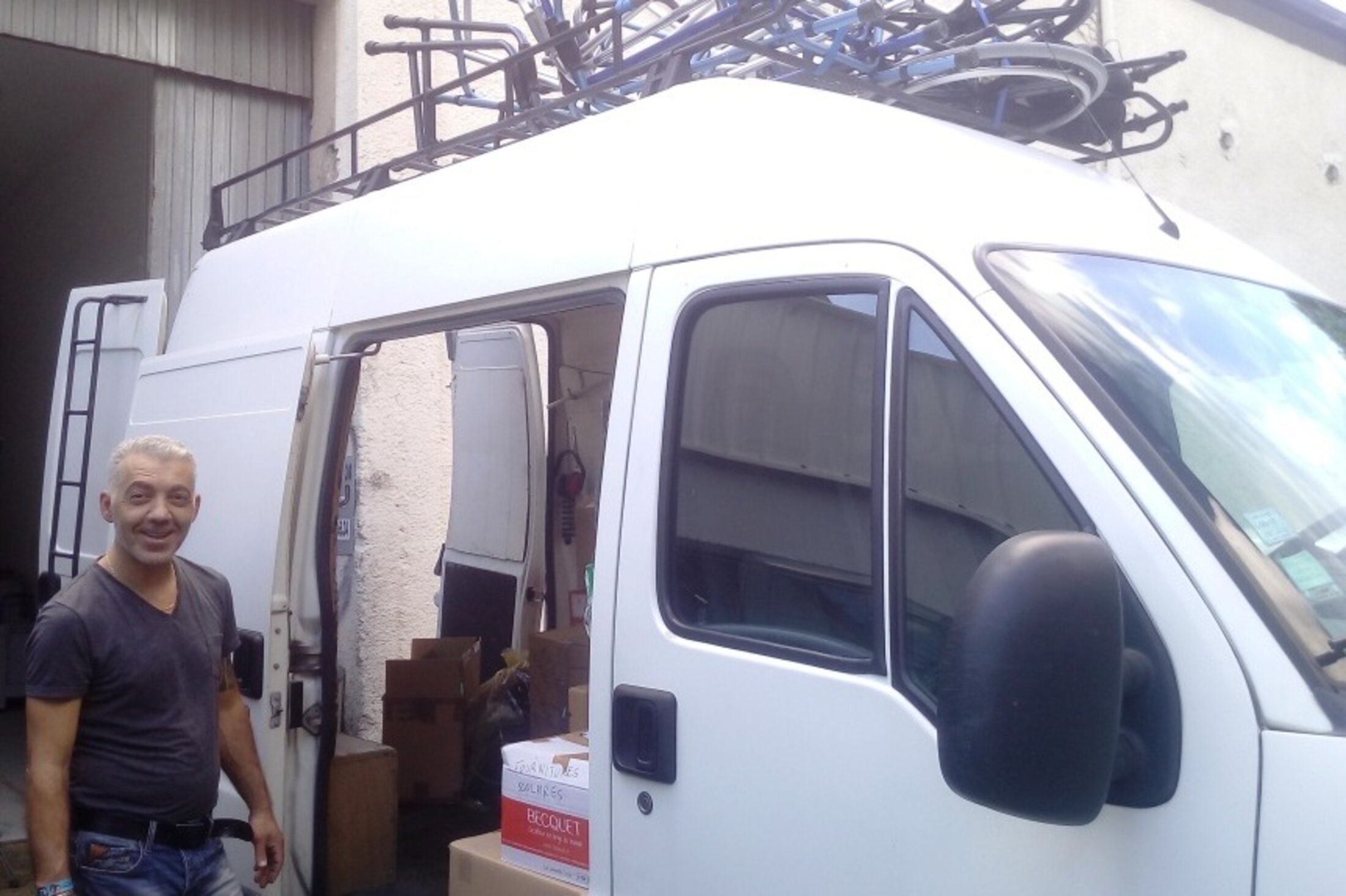 Mais aussi, en provenance d'Avignon, un fauteuil dentaire est chargé dans le van des normands. Quant à nous, nous avons finalement décidé de disposer du matériel sur la galerie : fauteuils roulants et deambulteurs prennent de l'altitude. D'autres ont récupéré le mobilier de consultation d'un médecin prenant da retraite.