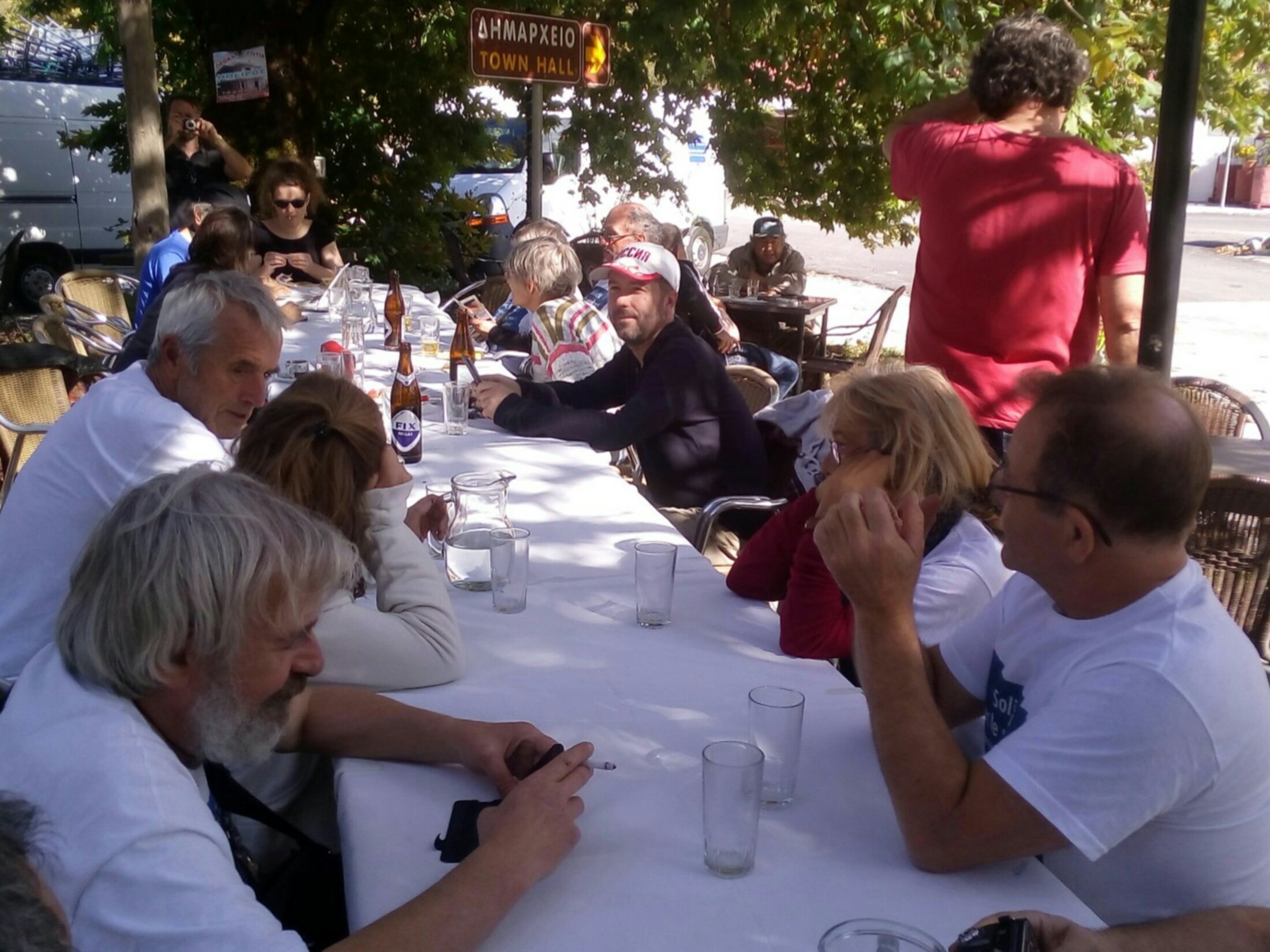 Il est 12h30, heure greque, nous débarquons enfin sur le sol hellénique. Thessalonique n'est plus qu'à trois heures de route. La première visite n'est prévue que demain. La Caravane se réunit donc à Tyria, petit village non loin du port, pour se prendre enfin un vrai repas où tous les membres vont se sentir unis par et pour la même cause.
