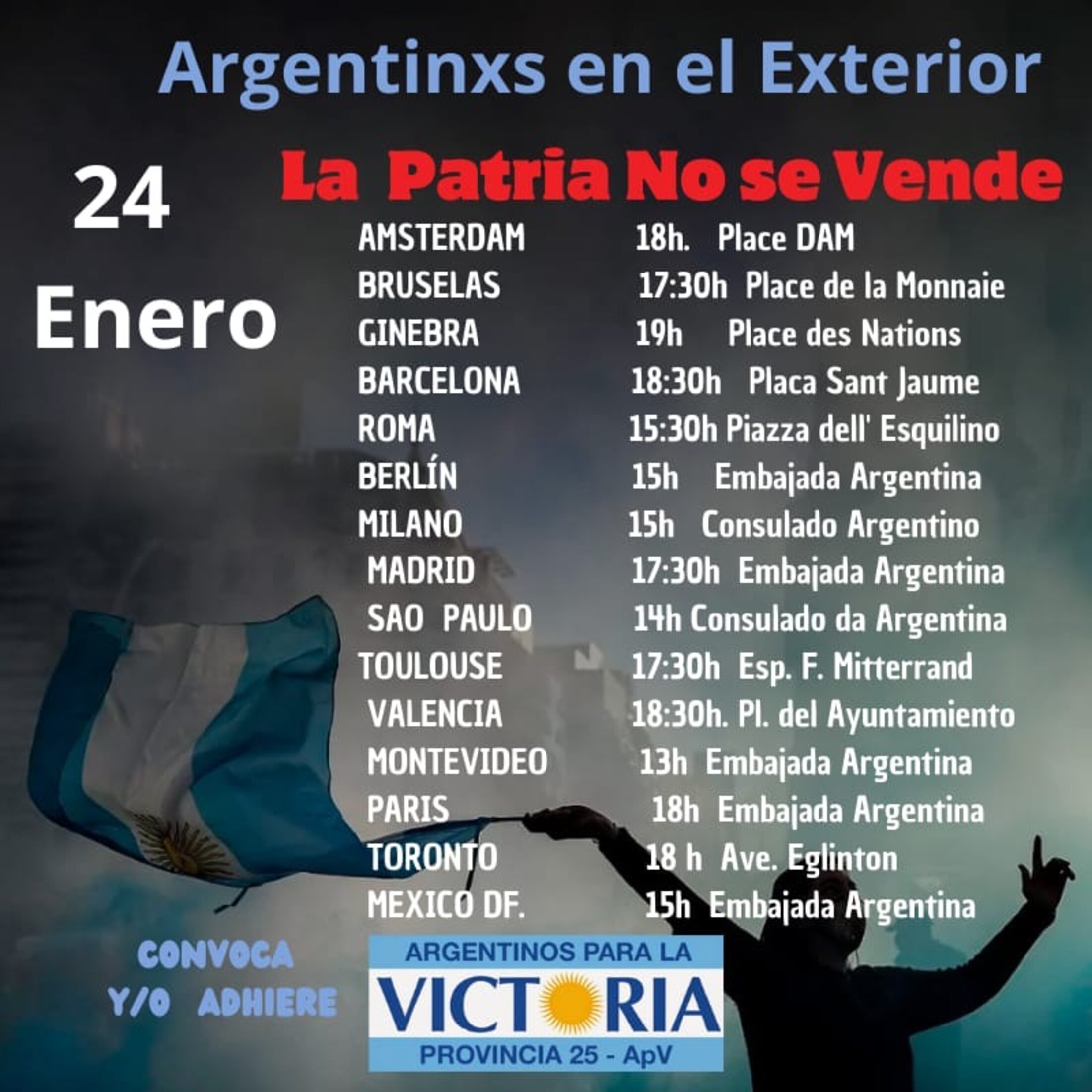Avec le mot d’ordre « La Argentina no se vende » (l’Argentine n’est pas à vendre) les argentins résidant à l’extérieur de leur pays, ont organisé de rassemblements ce 24 janvier pour protester contre la politique ultra-libérale du gouvernement d’extrême droite de Javier Milei. Berlin, Madrid, Barcelone, Valence, Rome, Bruxelles, Amsterdam, Paris et Toulouse font partie d’une longue liste de villes où auront lieu ces rassemblements. Il s'agit de la première grève générale avec mobilisation de l'histoire argentine à peine le gouvernement installé.