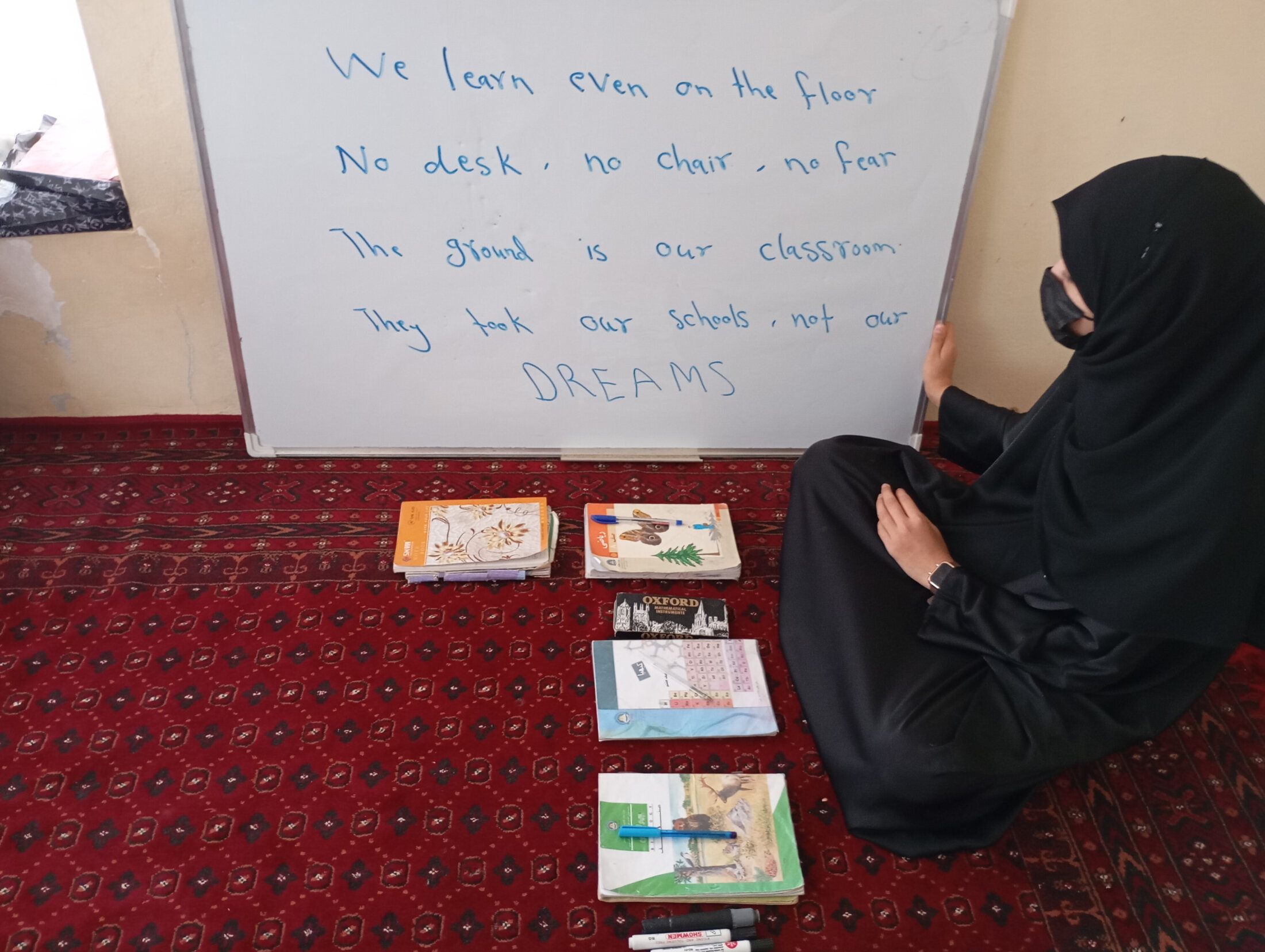 (Photo prise dans une école secrète dans un faubourg de Kaboul, mise en scène par des élèves de la 9ème classe. Sur la tableau on lit: nous apprenons même par terre, pas de pupitre, pas de chaise, pas de peur. Le sol est notre salle de classe. Ils nous a pris nos écoles mais pas nos RÊVES)