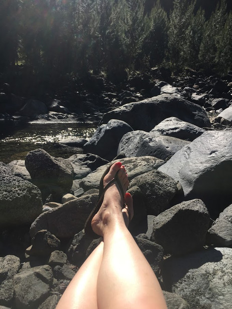 Après deux heures de descente, nous arrivons à la rivière des galets où nous profitons de faire un arrêt baignade. Elle est fraîche mais ça fait du bien ! En reprenant la route, nous remarquons vite que le sentier serpente dans la rivière et que la solution d'enlever et remettre les chaussures de marche n'est pas la plus rapide : nous finissons donc par chausser nos tongs jusqu'à ce que nous franchissions une quatrième et dernière fois la rivière.