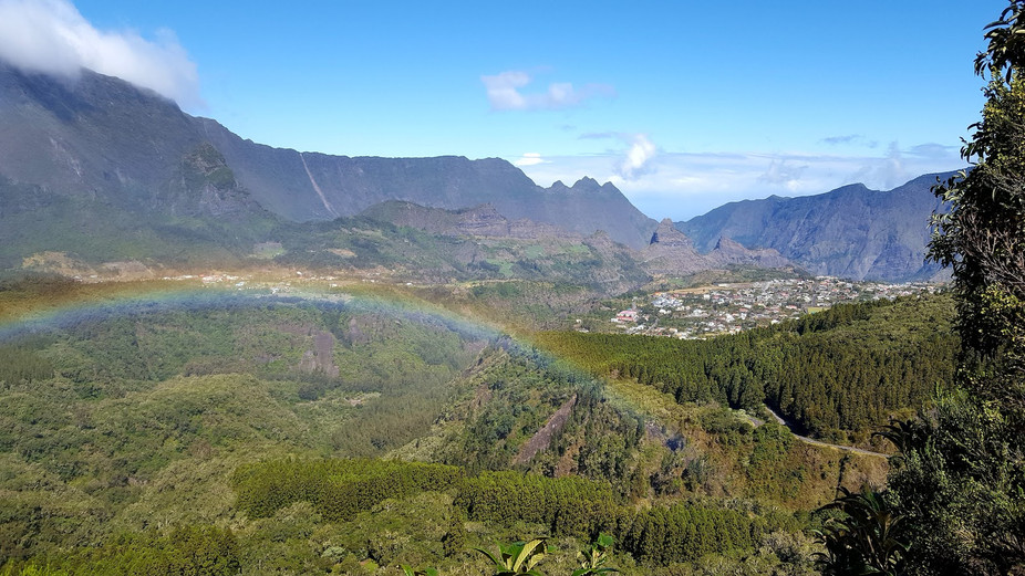 Nous quittons le gîte avec un magnifique soleil levant et nous dirigeons vers le Col du Taïbit. La montée n'est pas très longue et nous arrivons rapidement en haut, d'où nous apercevons Cilaos. Nous avons alors le sentiment que l'étape sera bien plus rapide que les 5h30 annoncées... Pas du tout ! La descente vers Cilaos est longue et trompeuse car bien que nous ayons toujours la ville en vue, celle-ci met du temps à devenir réelle.