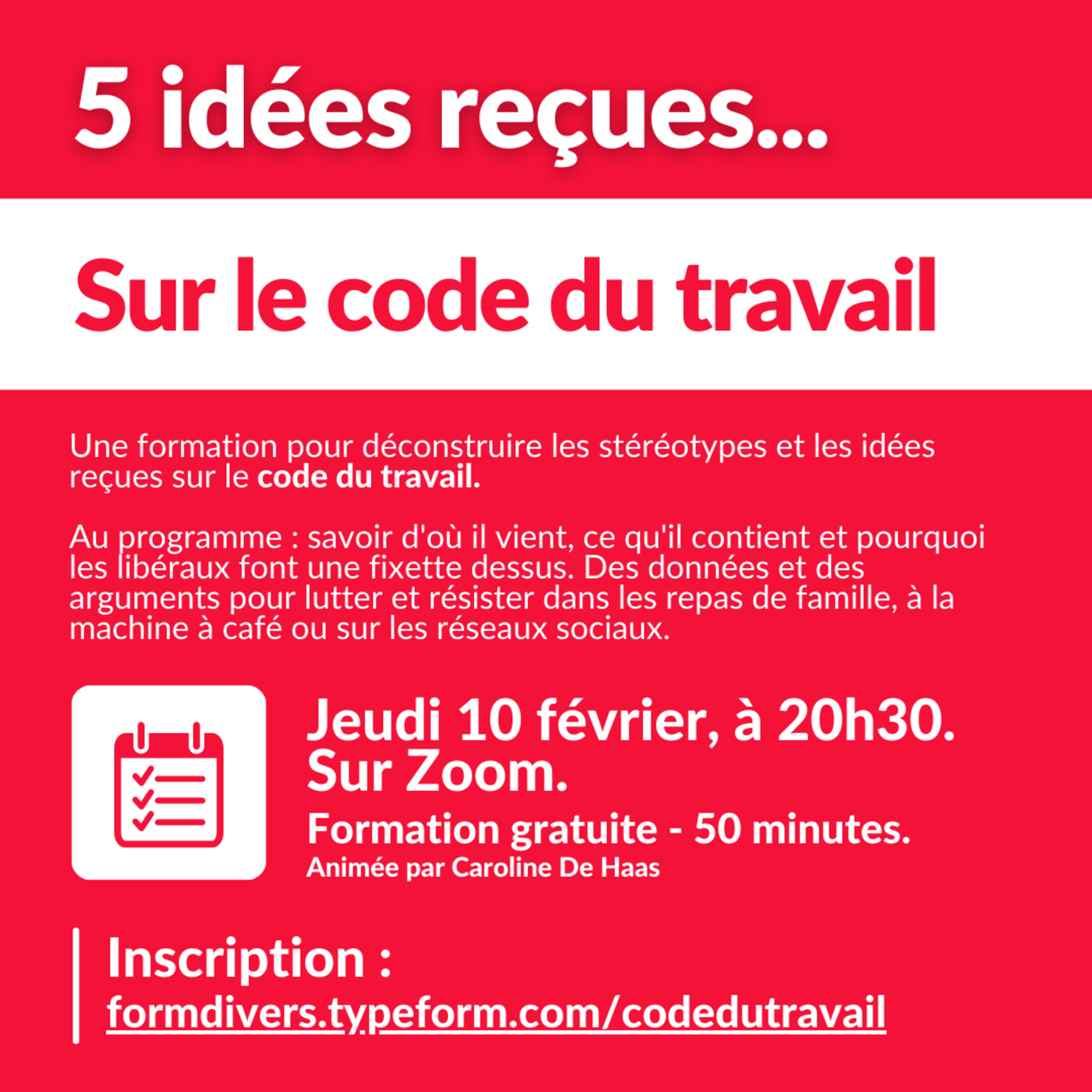 - 5 idées reçues sur le code du travail, jeudi 10 février, à 20h30, inscription : https://formdivers.typeform.com/codedutravail