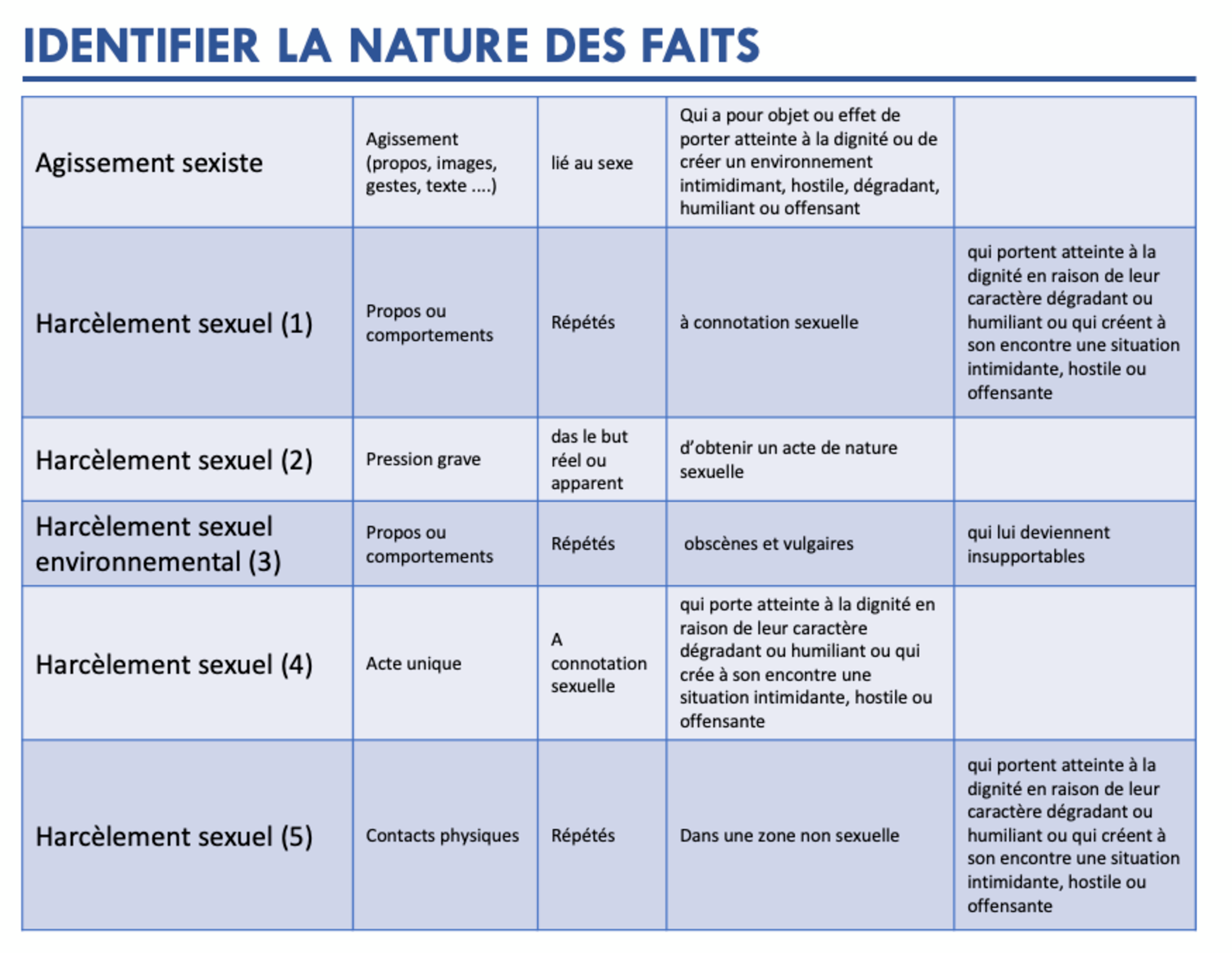 La première, c’est de connaître parfaitement la définition des différents types de violences et ce qu’en dit le code du travail (pour les salarié·e·s du privé) ou la loi Le Pors de 1983 (pour les fonctionnaires). Lorsque nous formons des personnels RH à la conduite d’enquêtes, nous passons beaucoup de temps sur les définitions.