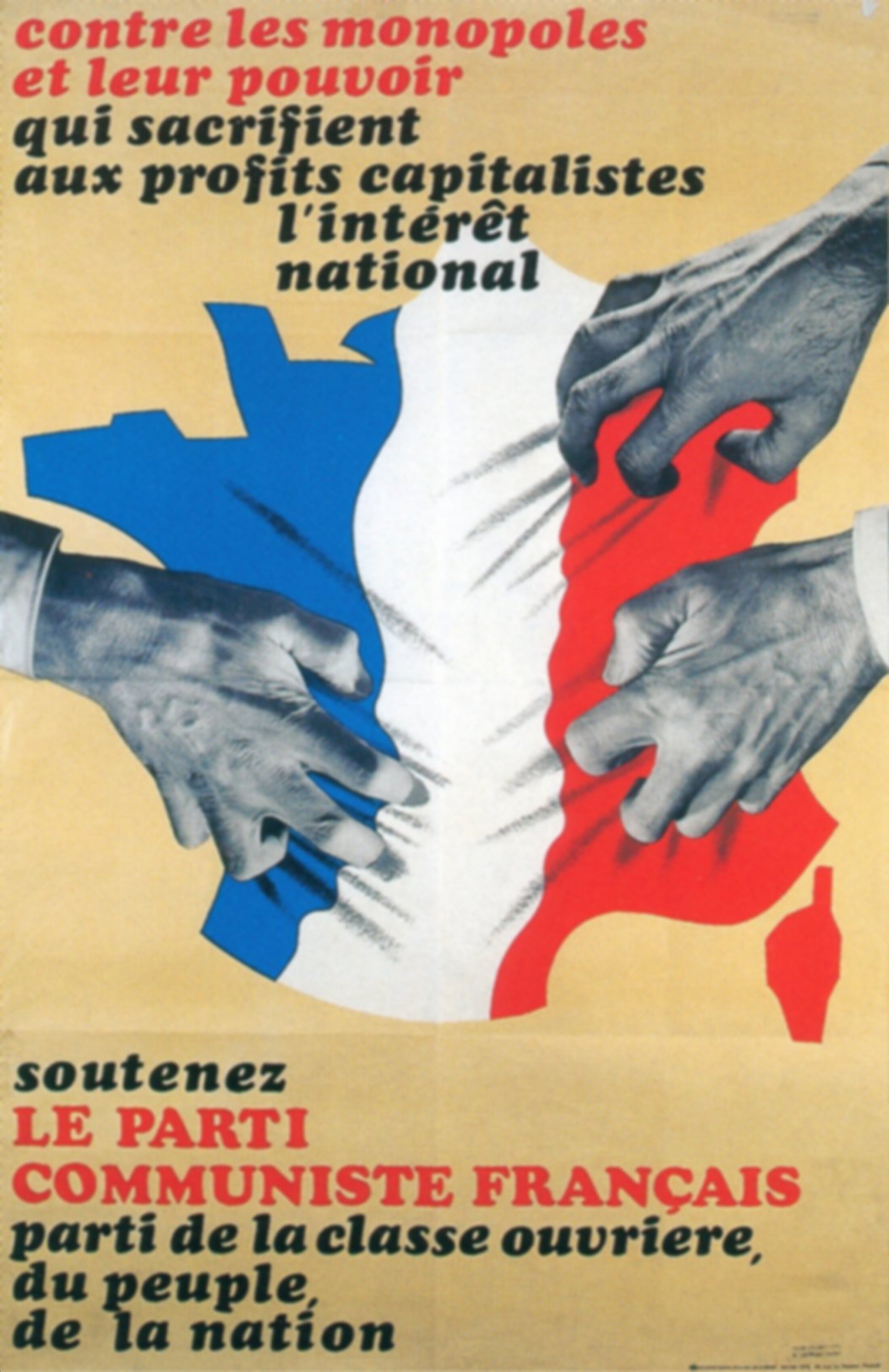 Sur cette affiche réalisée par le PCF dans les années 60, la carte de France bariolée (peinte en ?) de bleu, blanc et rouge. L’affiche oppose profits et intérêt national. Elle identifie le PCF à la défense de la classe ouvrière, du « peuple », de la « nation » et de « l’intérêt national ».