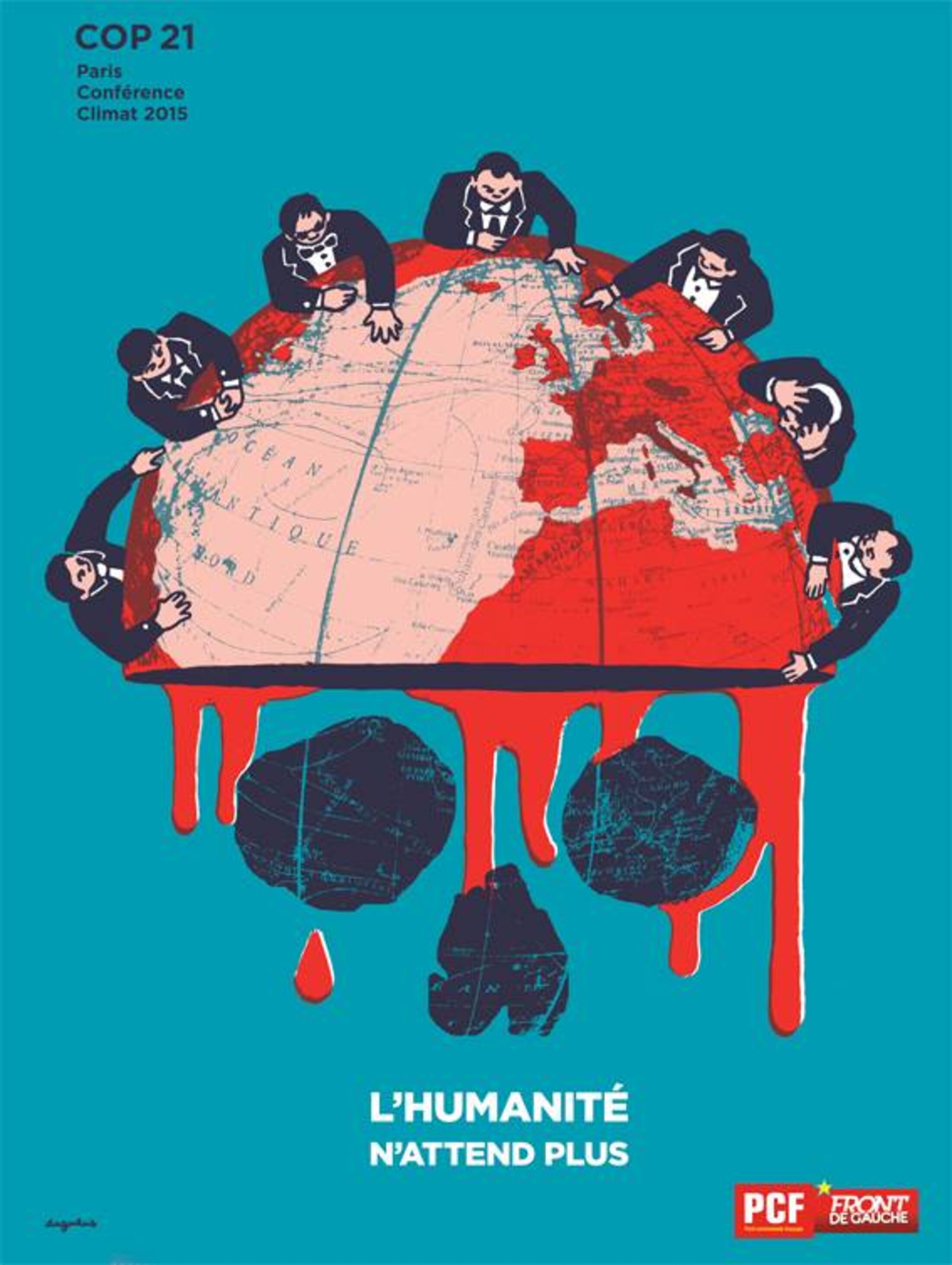 Carte réalisée par Dugudus et publiée par le PCF au moment de la conférence internationale contre le réchauffement climatique. Cette carte montre l’engagement des communistes dans la lutte contre le réchauffement climatique. En mettant en scène des capitalistes attablés autour d’une planète en sang, le PCF fait ici le lien entre la thématique anticapitaliste et l’enjeu climatique.
