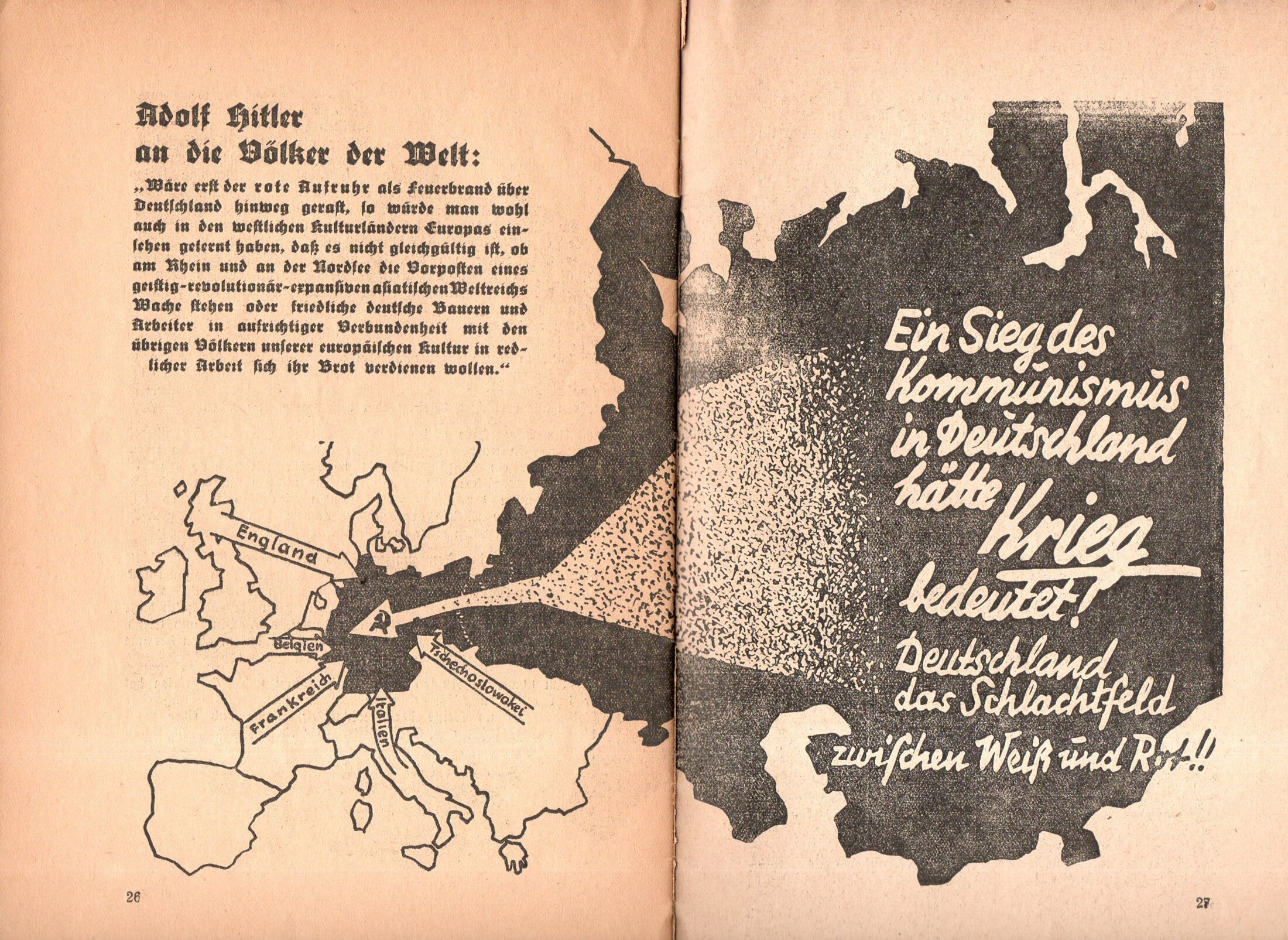 Carte parue dans une brochure d’une trentaine de pages, remplie de photos et d’images anti-communistes. La carte ci-dessus montre une Allemagne nazie menacée de toute part avec en premier lieu la menace gigantesque venant de l’est communiste. Cette menace est symbolisée par une flèche frappant directement le cœur de l’Allemagne, avec le marteau et la faucille (le symbole a seulement 16 ans à l’époque).