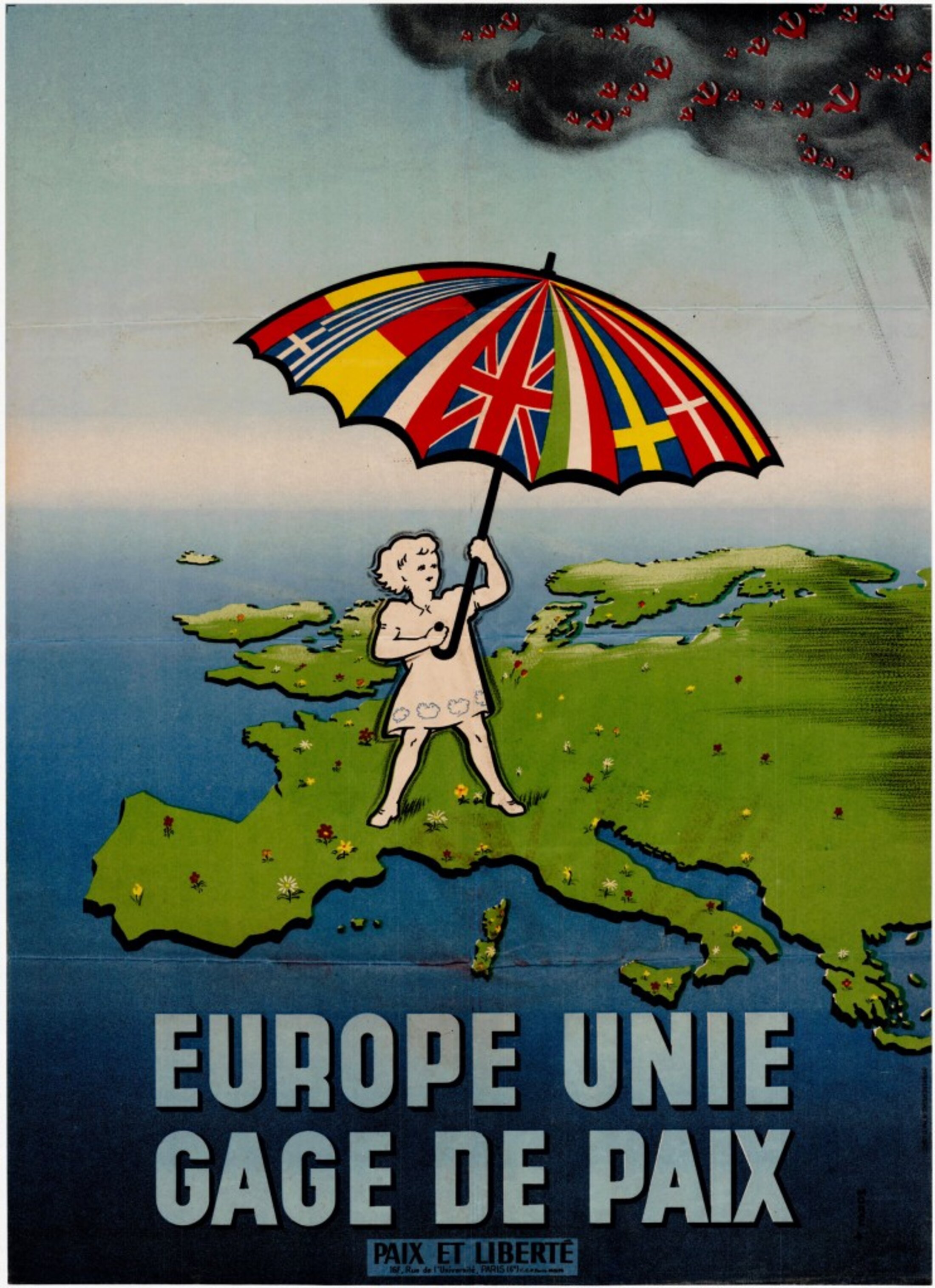 Cette carte a été publiée par Paix et Liberté, une organisation anticommuniste active en France entre 1950 et 1955. L’affiche présente une jeune femme à debout sur une Europe verdoyante, cherchant la protection contre les nuages d’orage du communisme à l’aide d’un parapluie orné des drapeaux des nations européennes.