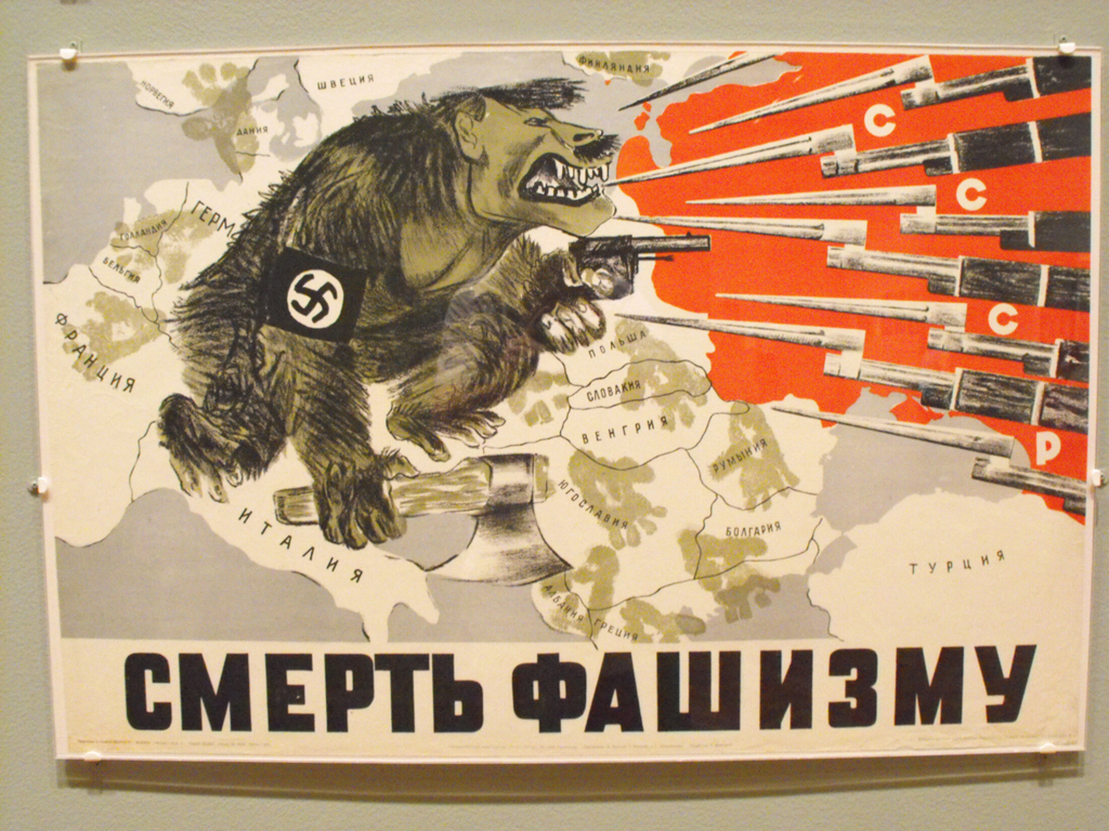 Cette carte réalisée en 1941 montre une Union soviétique déterminée à combattre l’Allemagne nazie, représentée ici bestialement.