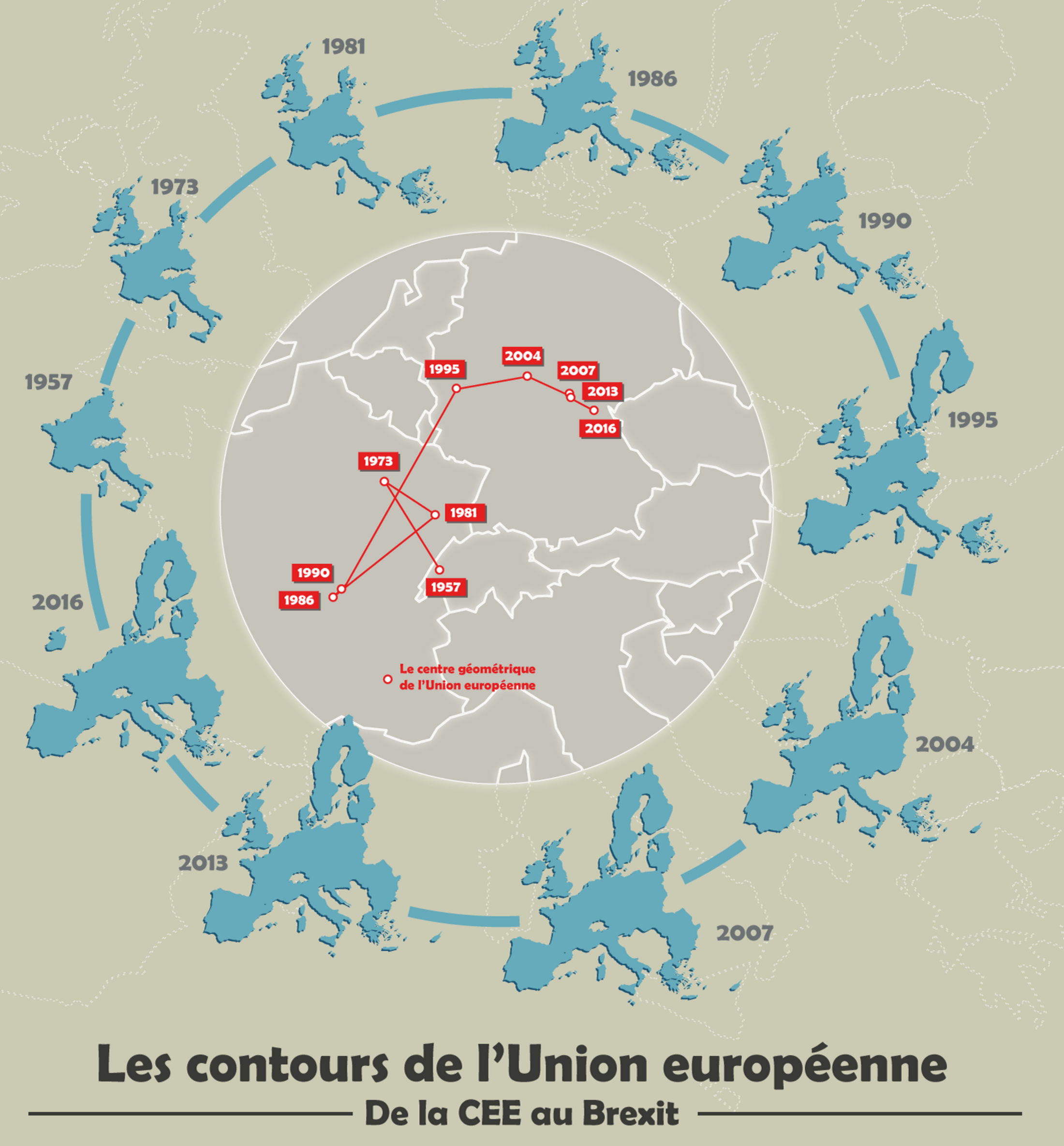 L’article 50 du traité de Lisbonne vient d’être activé par Theresa May. Les négociations commencent et quoi qu’il arrive, d’ici deux petites années qui vont passer bien vite, le Royaume quittera l’Union européenne. Tic tac tic tac. Je profite donc de cette actualité brulante pour déterrer une carte que j’ai réalisé au lendemain du vote des britanniques en faveur du Brexit. Cette carte “circulaire”, qui évoque la couronne du drapeau européen, dessine l’histoire récente de notre continent à travers ses différents élargissements. Cette carte nous montre aussi le déplacement du centre de gravité* de cette Union européenne aux contours évolutifs. Celui-ci se trouvait en Suisse en 1957 puis en France de 1973 à 1990. Depuis, avec les élargissements au Nord et surtout à l’Est, il se trouve Allemagne, et cela depuis 20 ans. Ironie de l’histoire, comme me l’a fait remarqué Hélène Roth**, le centre actuel de l’union européenne semble se rapprocher sérieusement du Mont Tillenberg dans le nord-est de la Bavière, considéré en 1865 comme le centre de l’Europe (et non de l’union européenne). Comme si l’histoire européenne revenait au point de départ. Amusant non ?