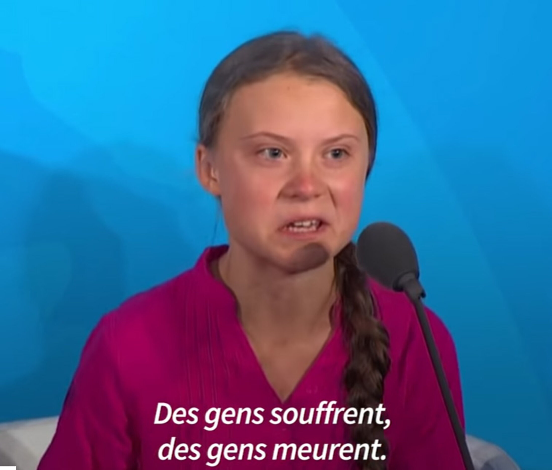 « Les gens souffrent, ils meurent. Des écosystèmes entiers s’effondrent, nous sommes au début d’une extinction de masse, et tout ce dont vous parlez, c’est d’argent, et des contes de fées de croissance économique éternelle ? Comment osez-vous ! »