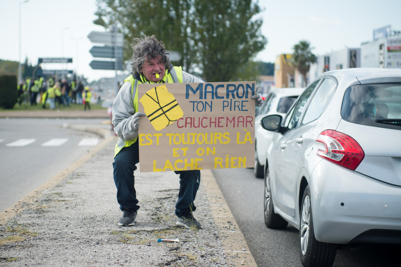 13H20 – Maria la GJ s'adresse à la caméra : « SVP mes petits GJ... » Jean-Michel, Théo, Sébastien… toujours présents… Jean-Michel au mégaphone : AH CA IRA CA IRA LE MACRON A LA LANTERNE ON LE PENDRA PAR LES PIEDS…