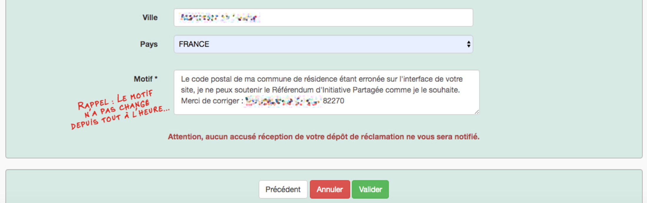 Dans l'intervalle j'avais communiqué sur les réseaux sociaux où on m'avait confirmé que le code de la commune n'était pas une erreur mais bien celui de l'INSEE ; ma réclamation envoyée quelques minutes plus tôt serait donc caduque... Tant pis, une manipulation informatique de plus ou de moins... D'ailleurs, je la publie ci-après pour le plaisir d'observer la mise au point subtile, quoique bête et méchante, de ce formulaire à l'ère du numérique.