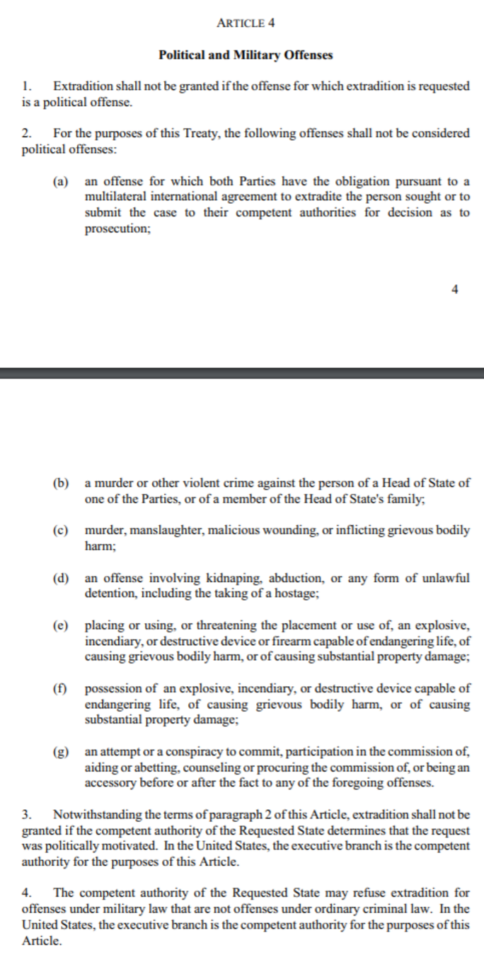 A ce stade, Baraitser explique qu'il est clair que l'intention du Parlement est de permettre l'extradition pour des délits politiques. Sinon, il n'aurait pas supprimé la restriction dans la législation précédente. Fitzgerald a rejeté cet avis, affirmant que la loi ne dit pas que l'extradition pour des délits politiques ne peut pas être interdite par le traité autorisant l'extradition.
