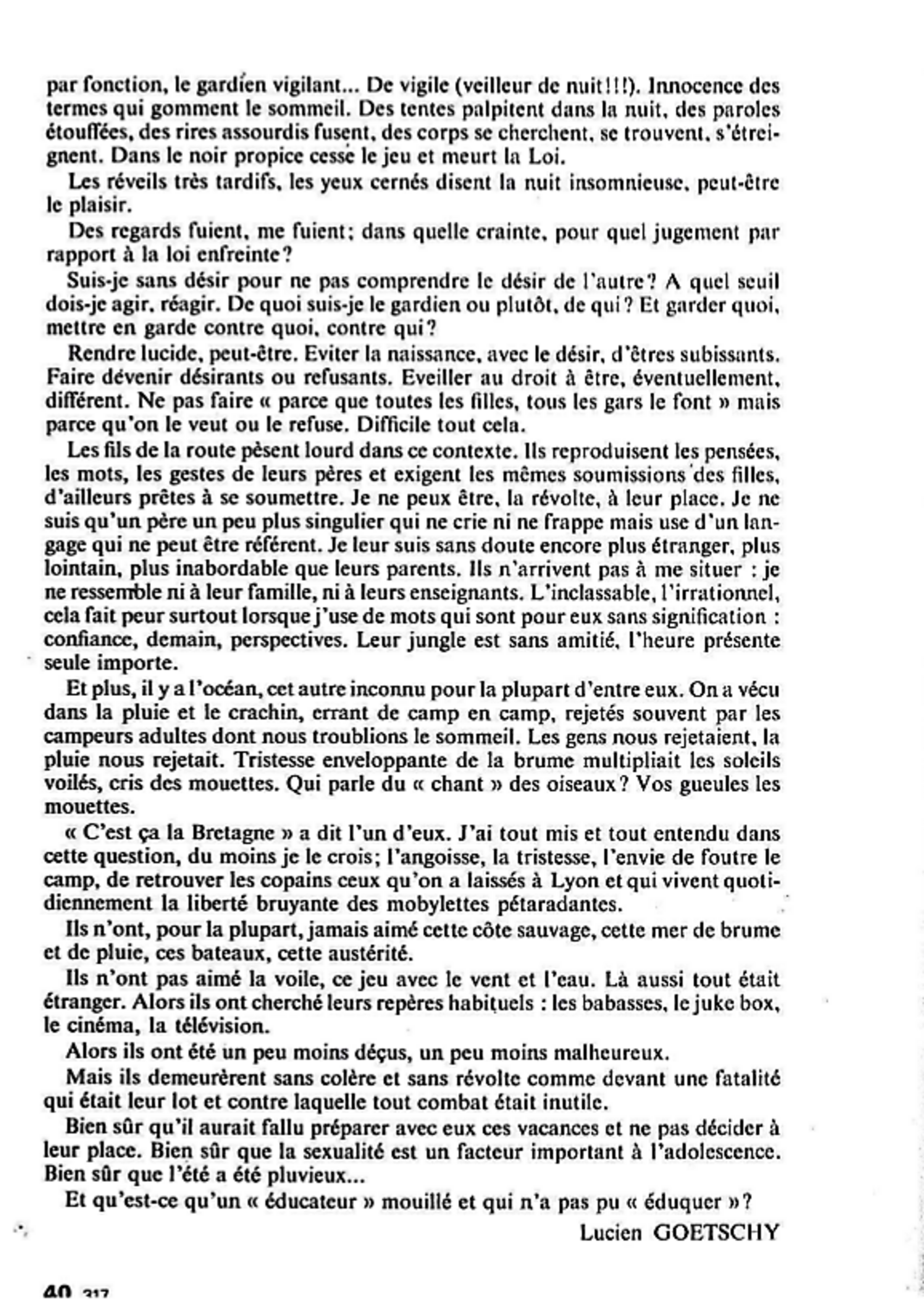 // Ados // Pas facile de pousser à vivre des adolescents qui n’y croient plus. Pas facile de faire cohabiter ceux qui ont un avenir et ceux qui pensent qu’ils n’en ont pas. Comment être éducateur ? Lucien Goetshy, Vers l’Éducation Nouvelle n° 317, novembre 1977.