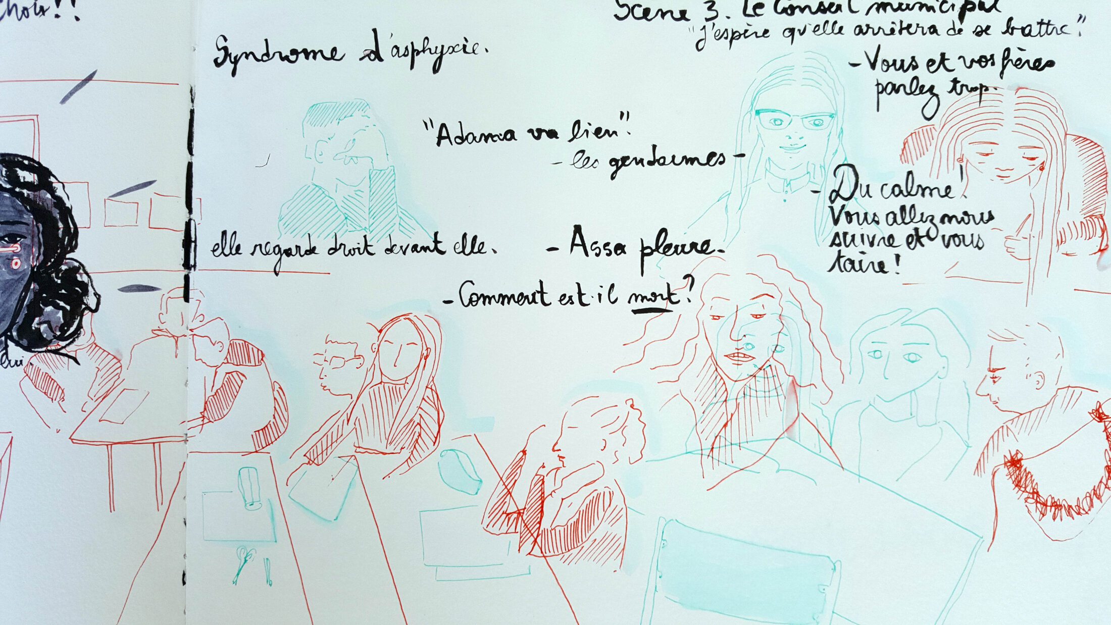 Croquis réalisés en direct, lors des séances d'écriture.