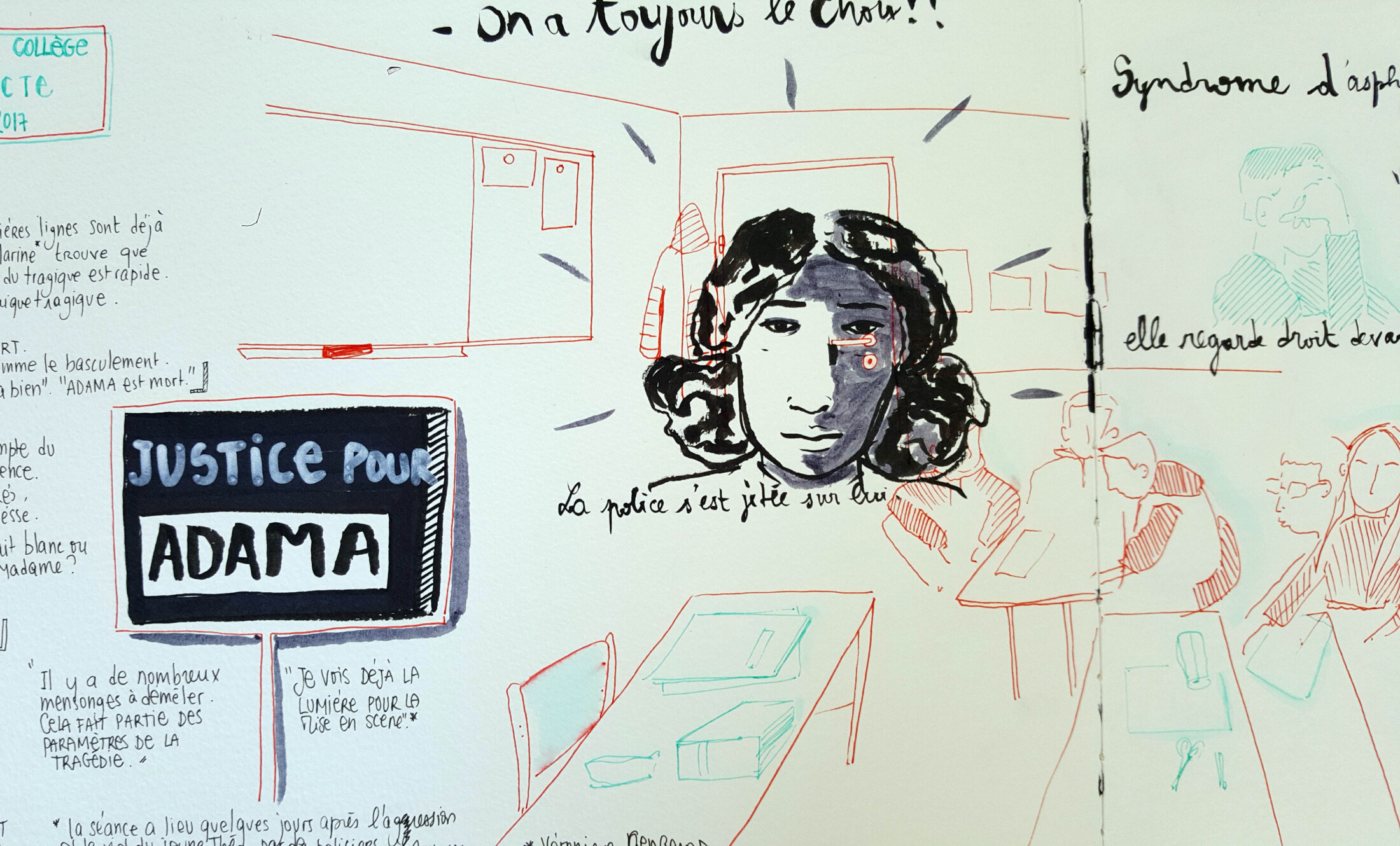 Quand je rejoins le travail en cours, la classe a déjà bien avancé. Les jeunes semblent très au fait des derniers éléments de l'enquête autour de la mort d'Adama Traoré. Quelques jours avant cette séance d'écriture, il y a eu Théo. C'est dans toutes les conversations.